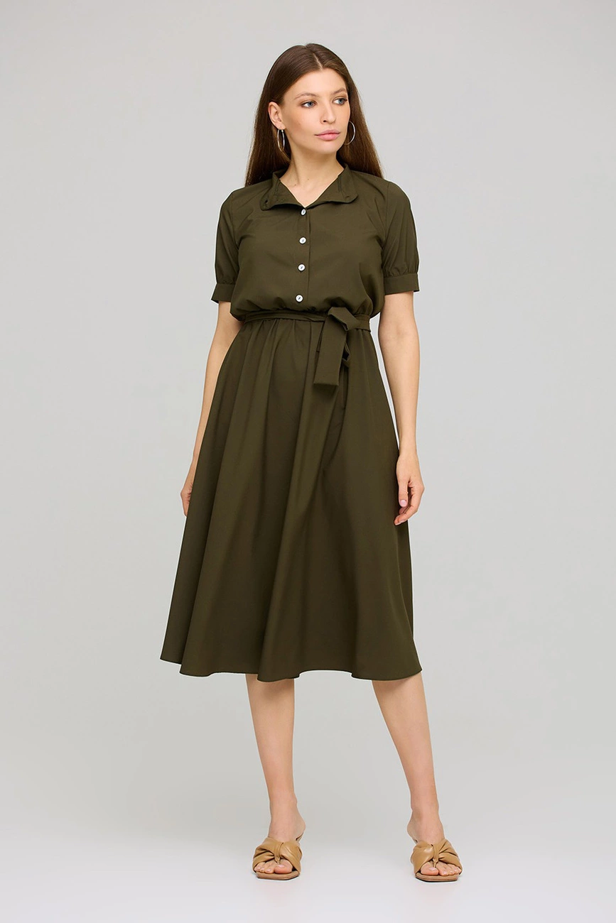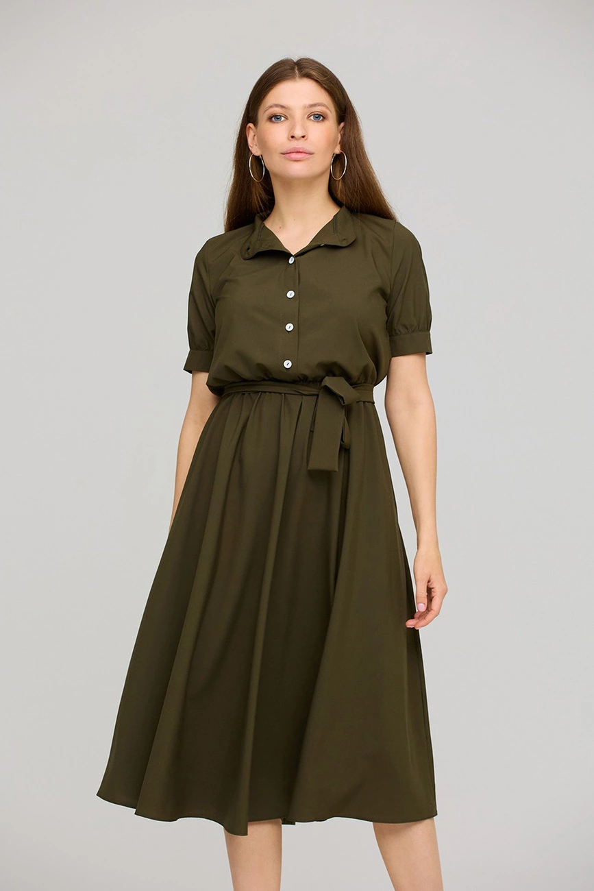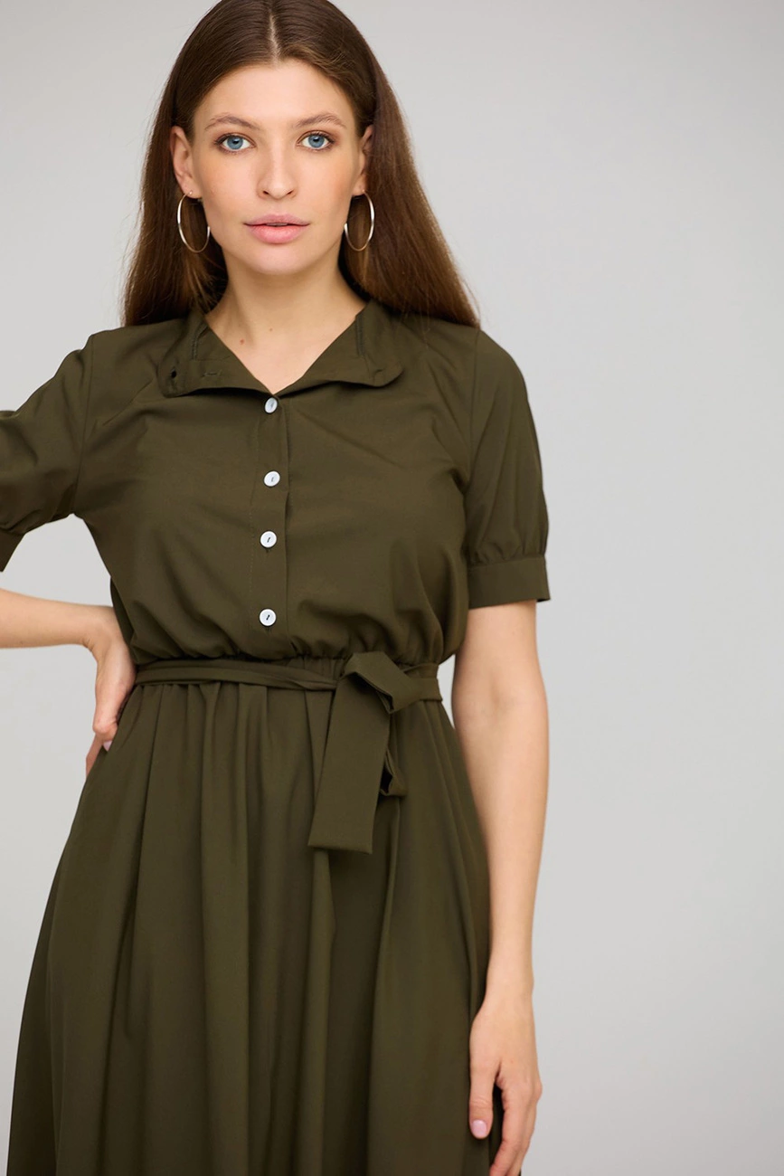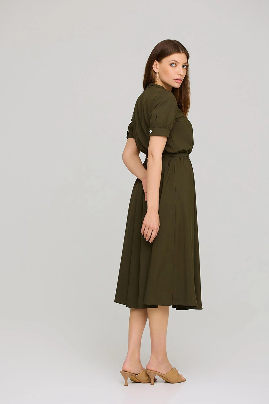 Платье приталенного кроя из приятной на ощупь ткани, воротник- стойка, рукав короткий с манжетами на пуговицах , отрезная линия талии, длина миди; застежка: пуговицы, пояс в комплекте; есть карманы