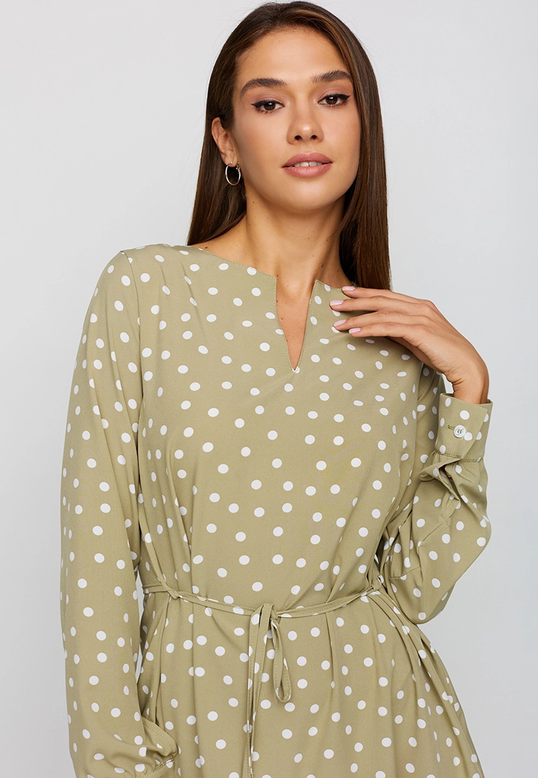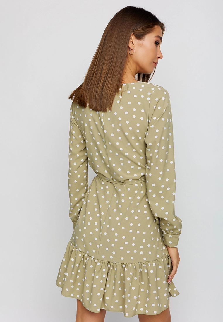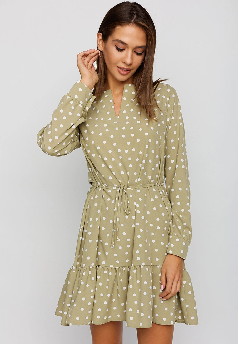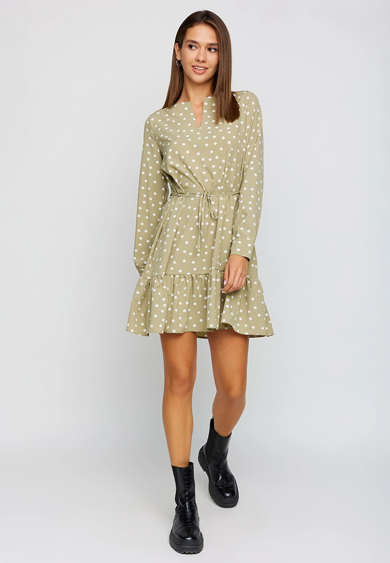 Платье длиной выше колена из легкой ткани, впереди неглубокий вырез, рукав длинный широкий с манжетами, по низу изделия волан; застежка: пуговица сзади