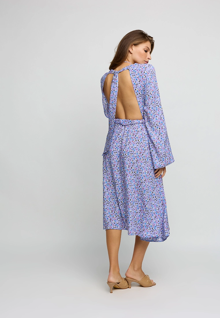 Платье длины миди из легкого штапеля, длинный расклешенный рукав, открытая спина, на талии резинка, на спине длинные завязки