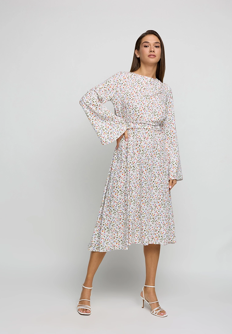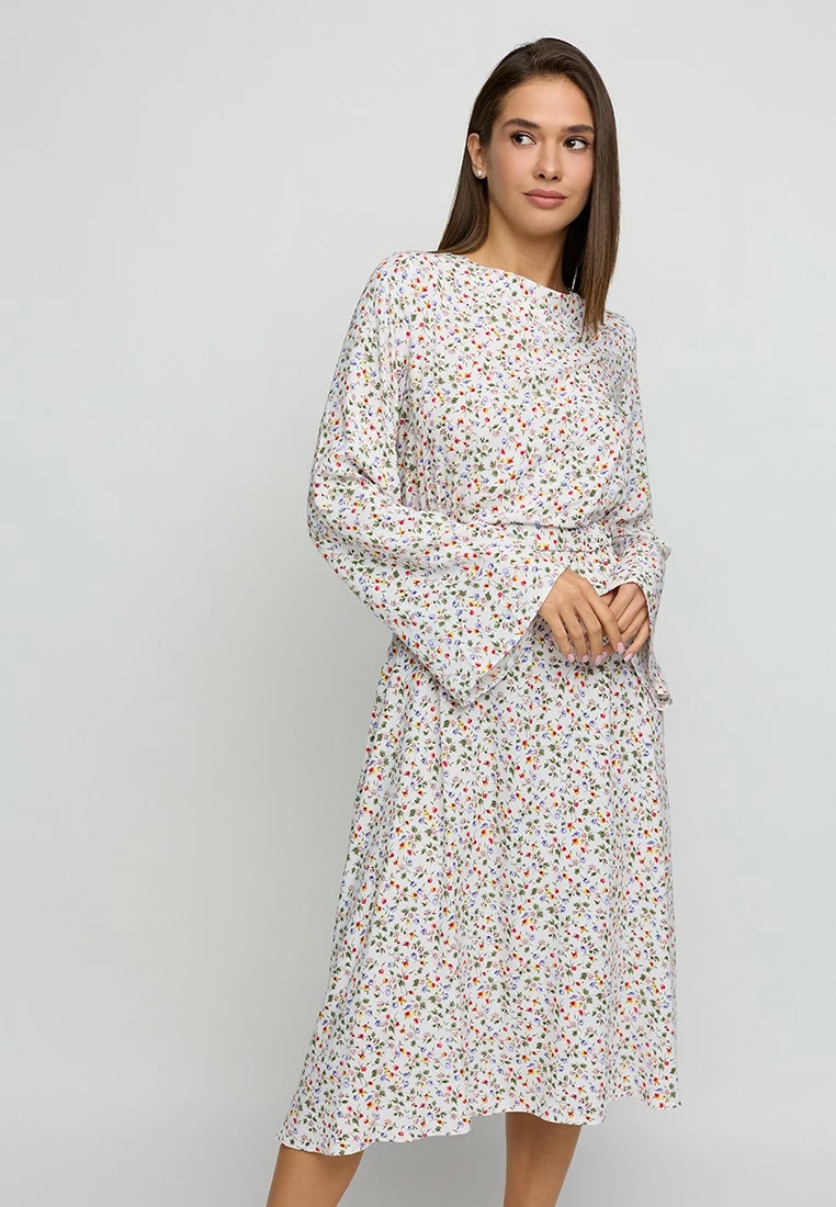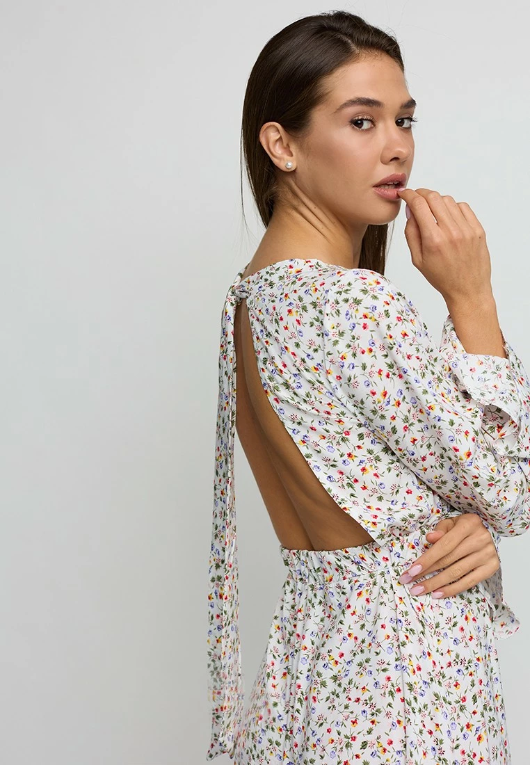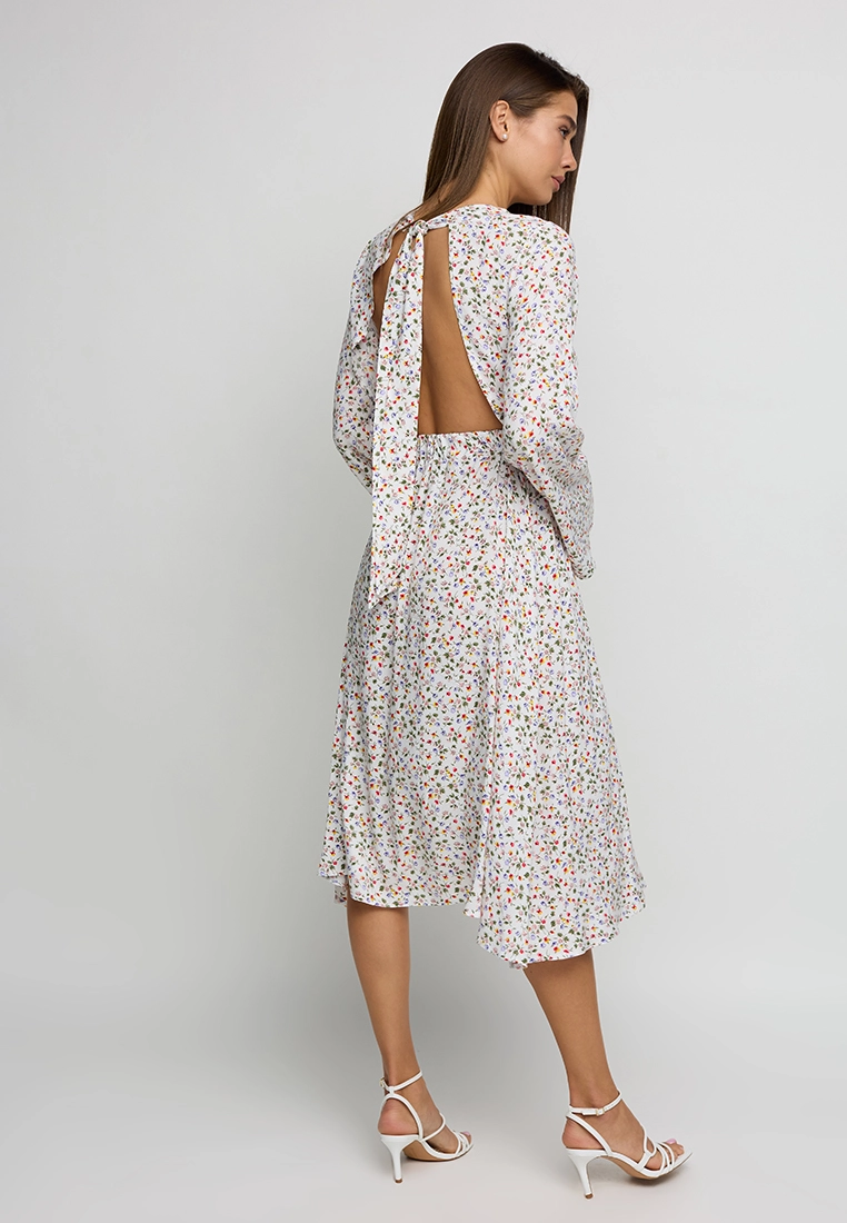 Платье длины миди из легкого штапеля, длинный расклешенный рукав, открытая спина, на талии резинка, на спине длинные завязки