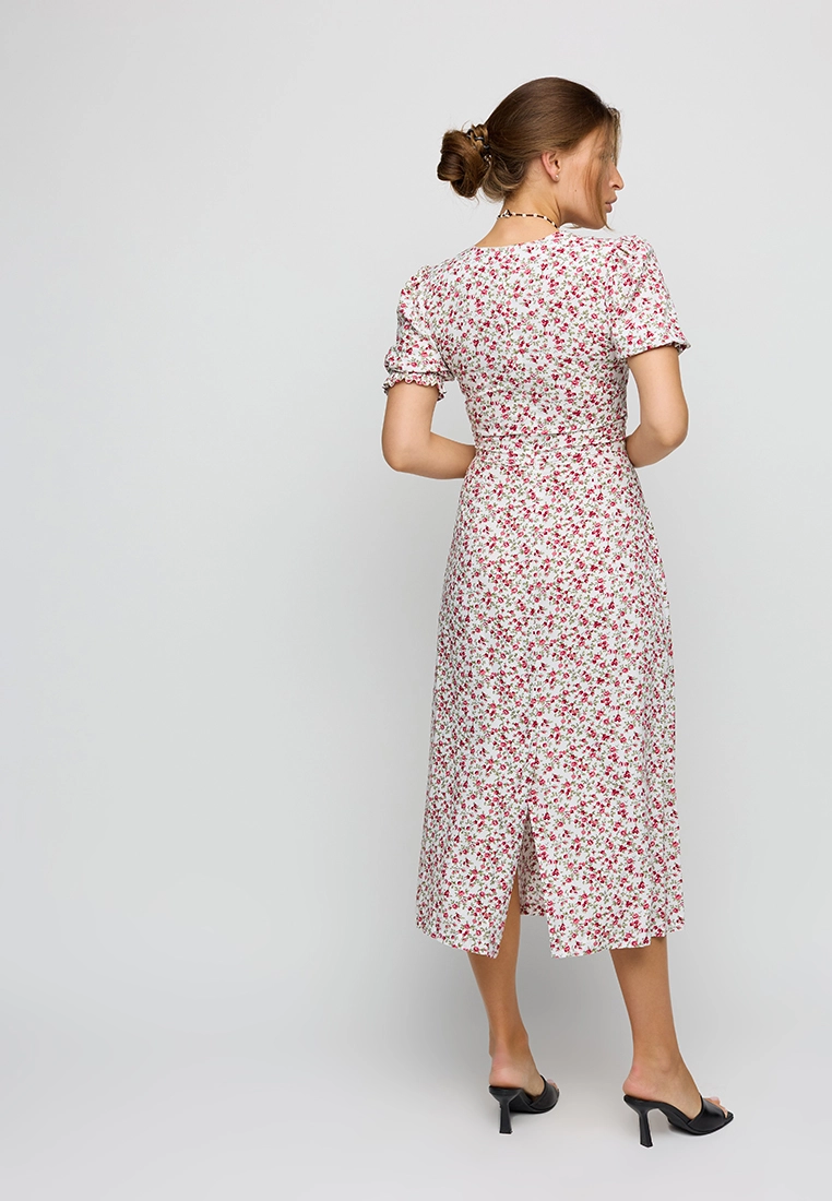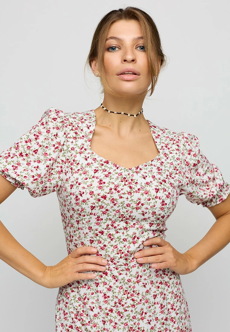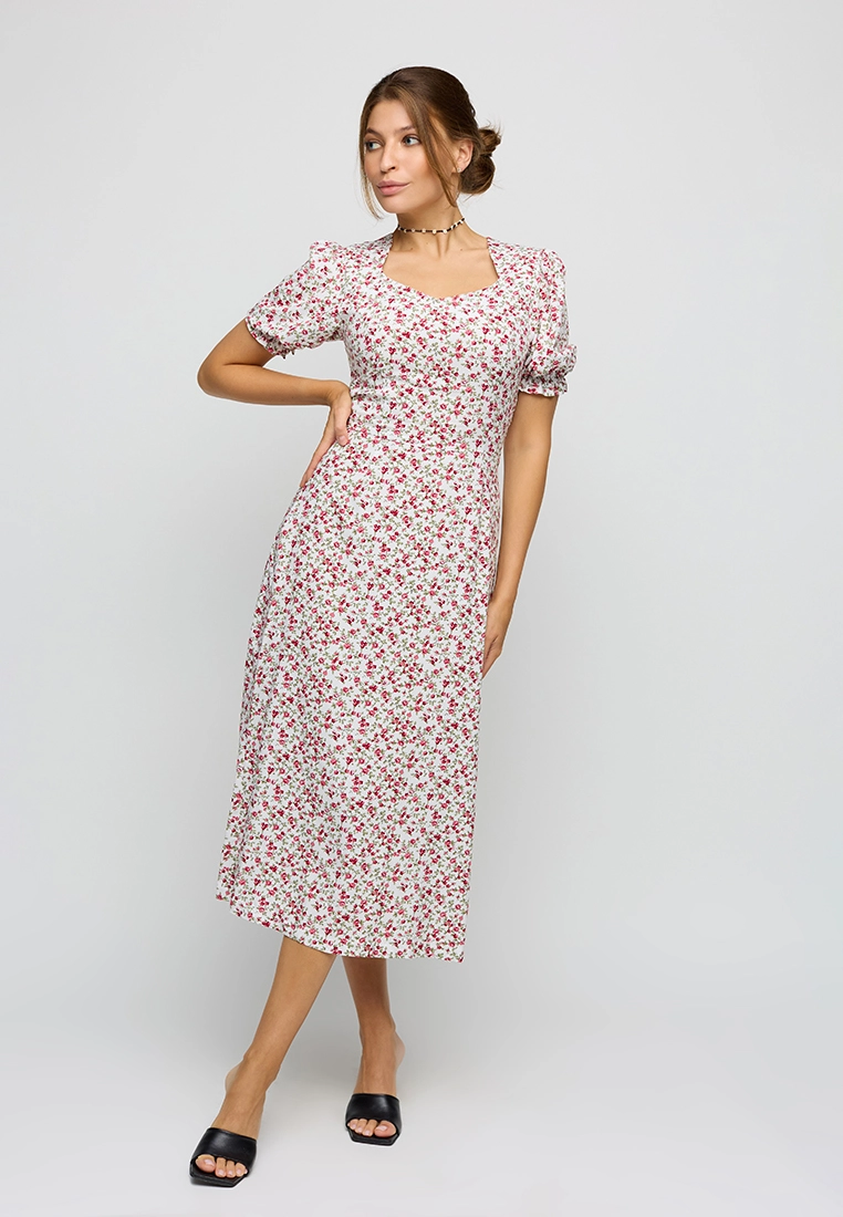 Платье длины миди из легкой летней ткани; приталенный крой; короткий, широкий рукав собран на резинку; по груди фигурный вырез; сзади разрез-шлица; застежка: змейка по спине
