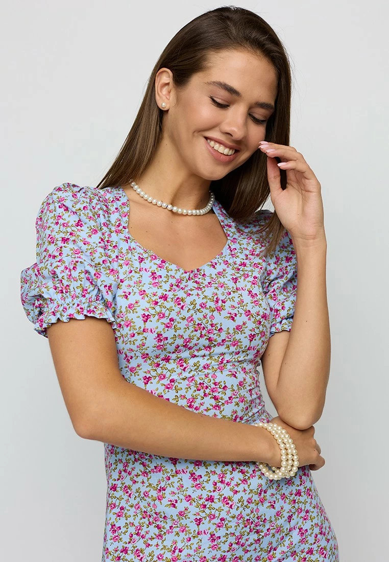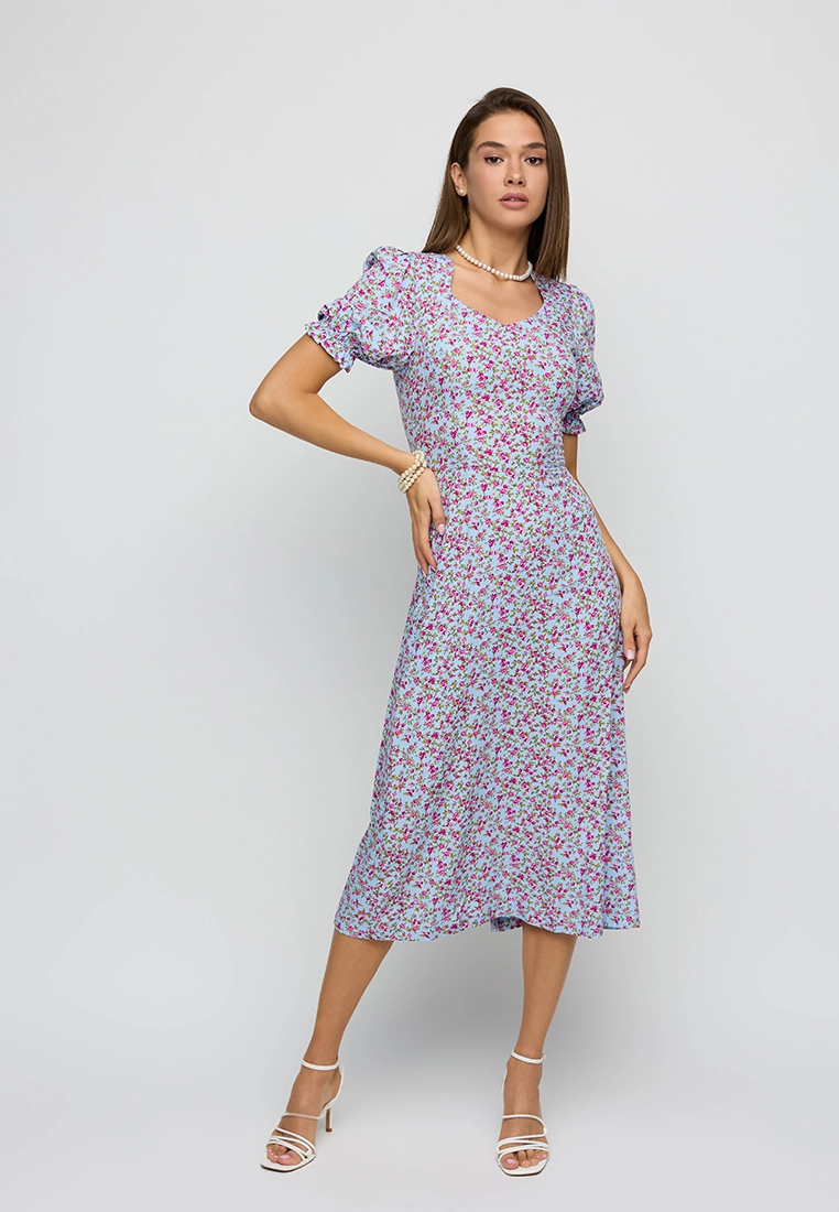 Платье длины миди из легкой летней ткани; приталенный крой; короткий, широкий рукав собран на резинку; по груди фигурный вырез; сзади разрез-шлица; застежка: змейка по спине