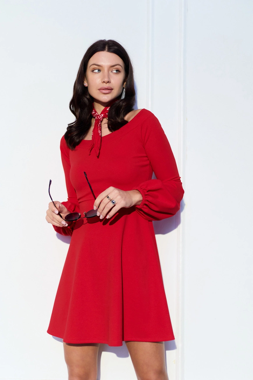 Платье с обтягивающим верхом и открытыми плечами из эластичного трикотажа, рукав-фонарик, юбка- полусолнце