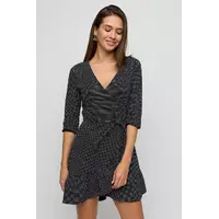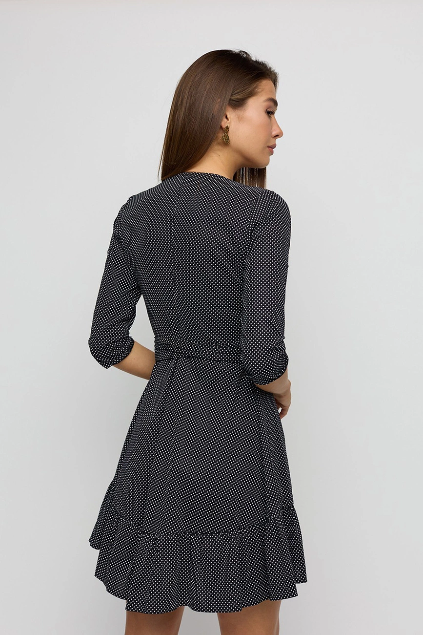 Платье мини из хлопковой ткани с запахом, рукав 3/4, декорировано оборкой по юбке, фиксируется с помощью пояса