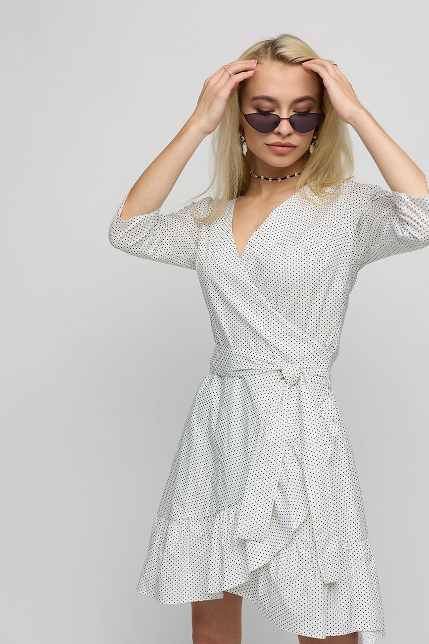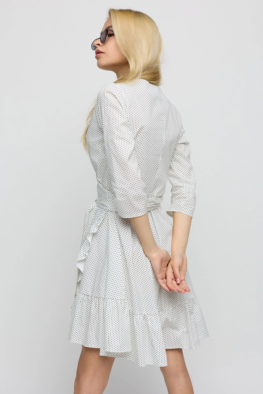 Платье мини из хлопковой ткани с запахом, рукав 3/4, декорировано оборкой по юбке, фиксируется с помощью пояса