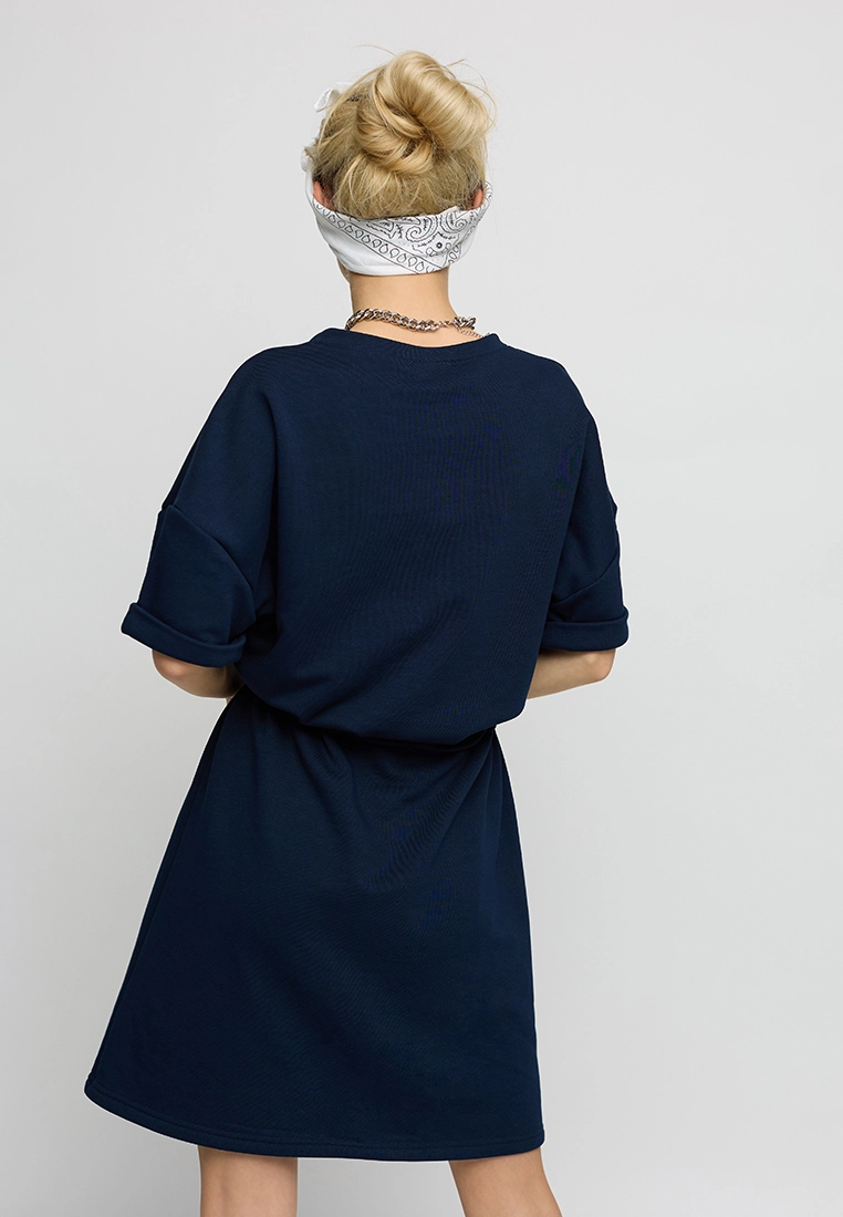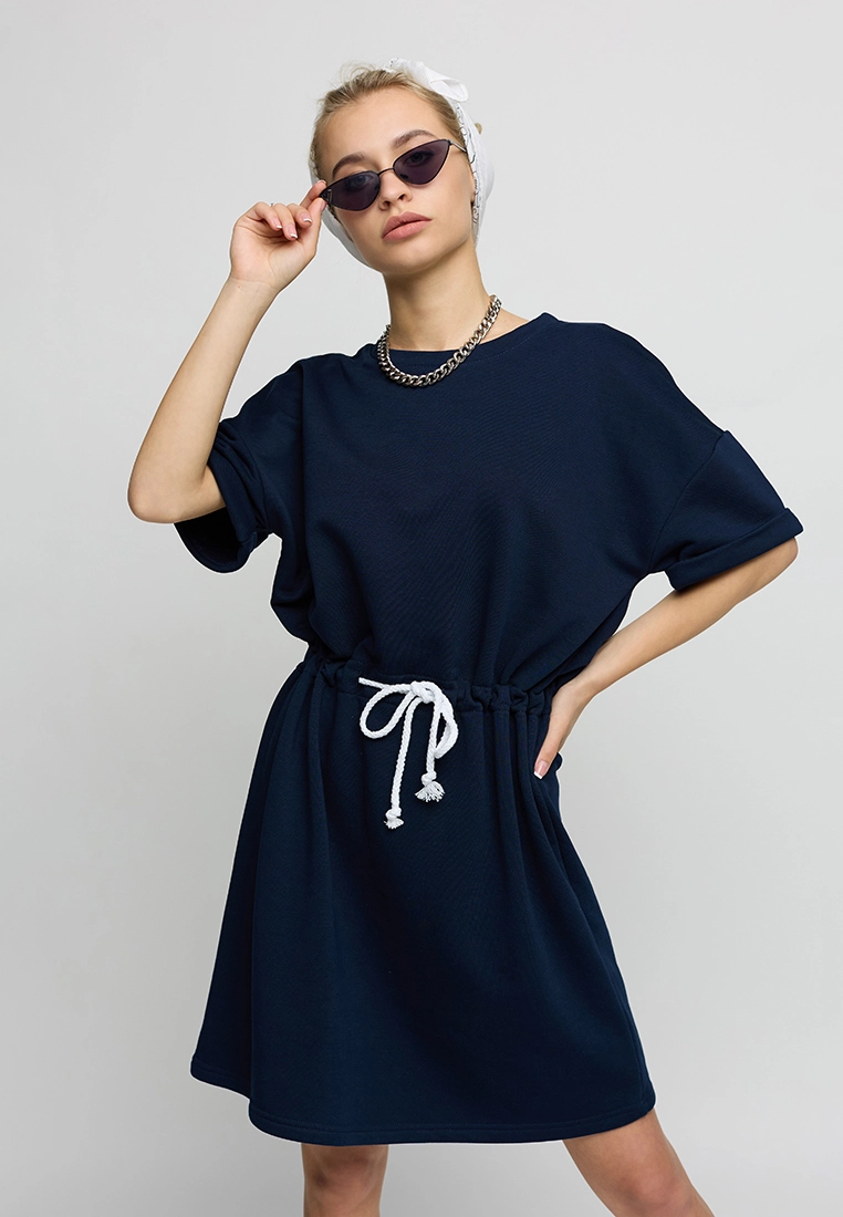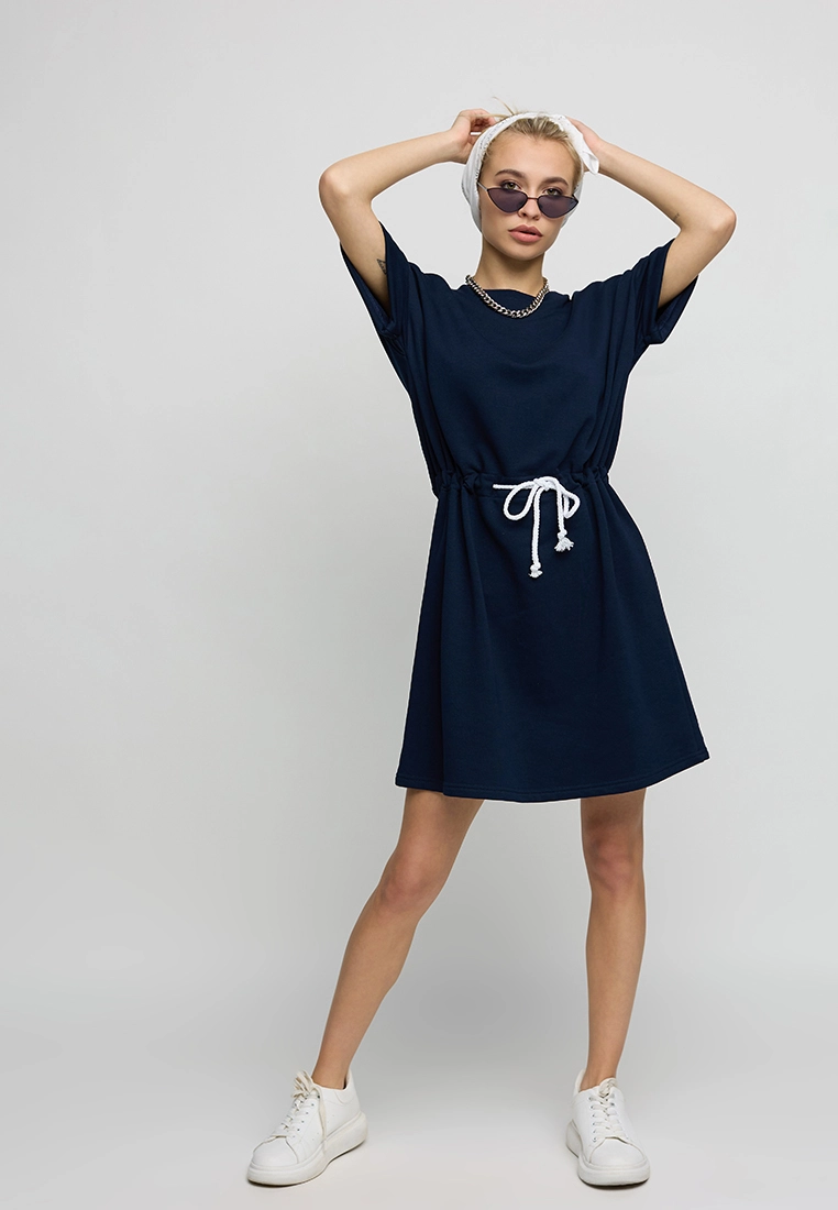 Платье в спортивном стиле из трикотажа; длина мини; спущенное плече, короткий рукав с манжетом; в поясе кулиса со шнуром.