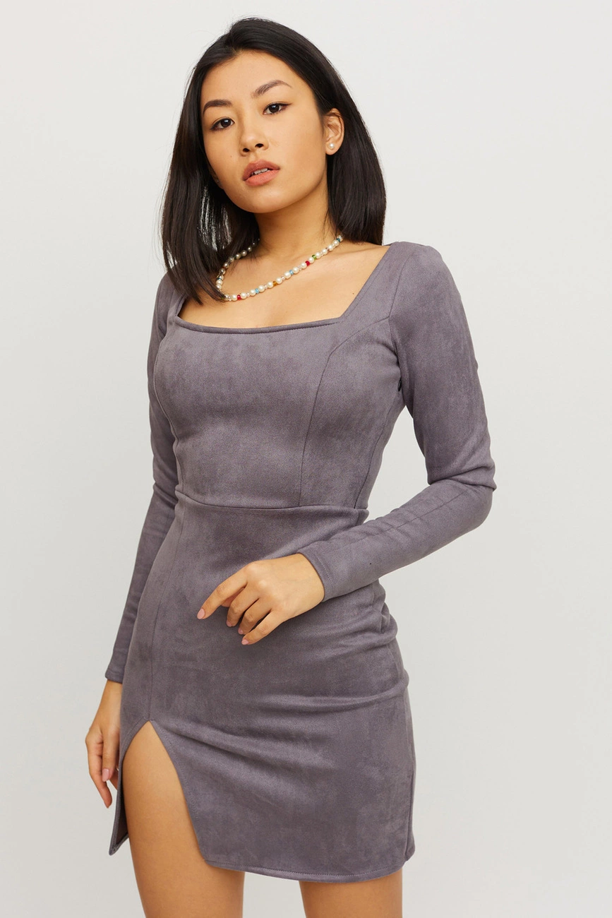 Платье-футляр мини длины из искуственного замша. Небольшой разрез, змейка в левом боку.