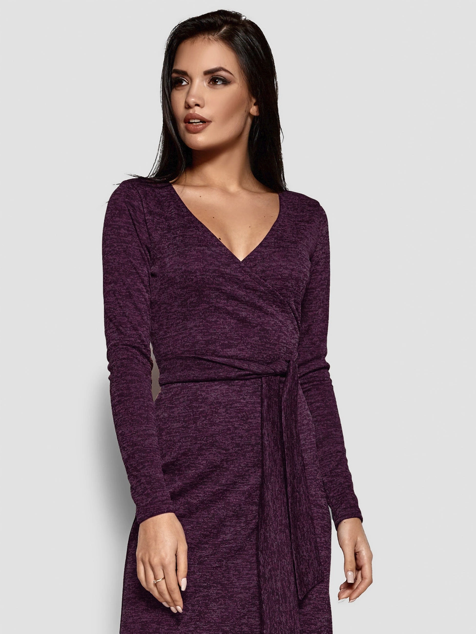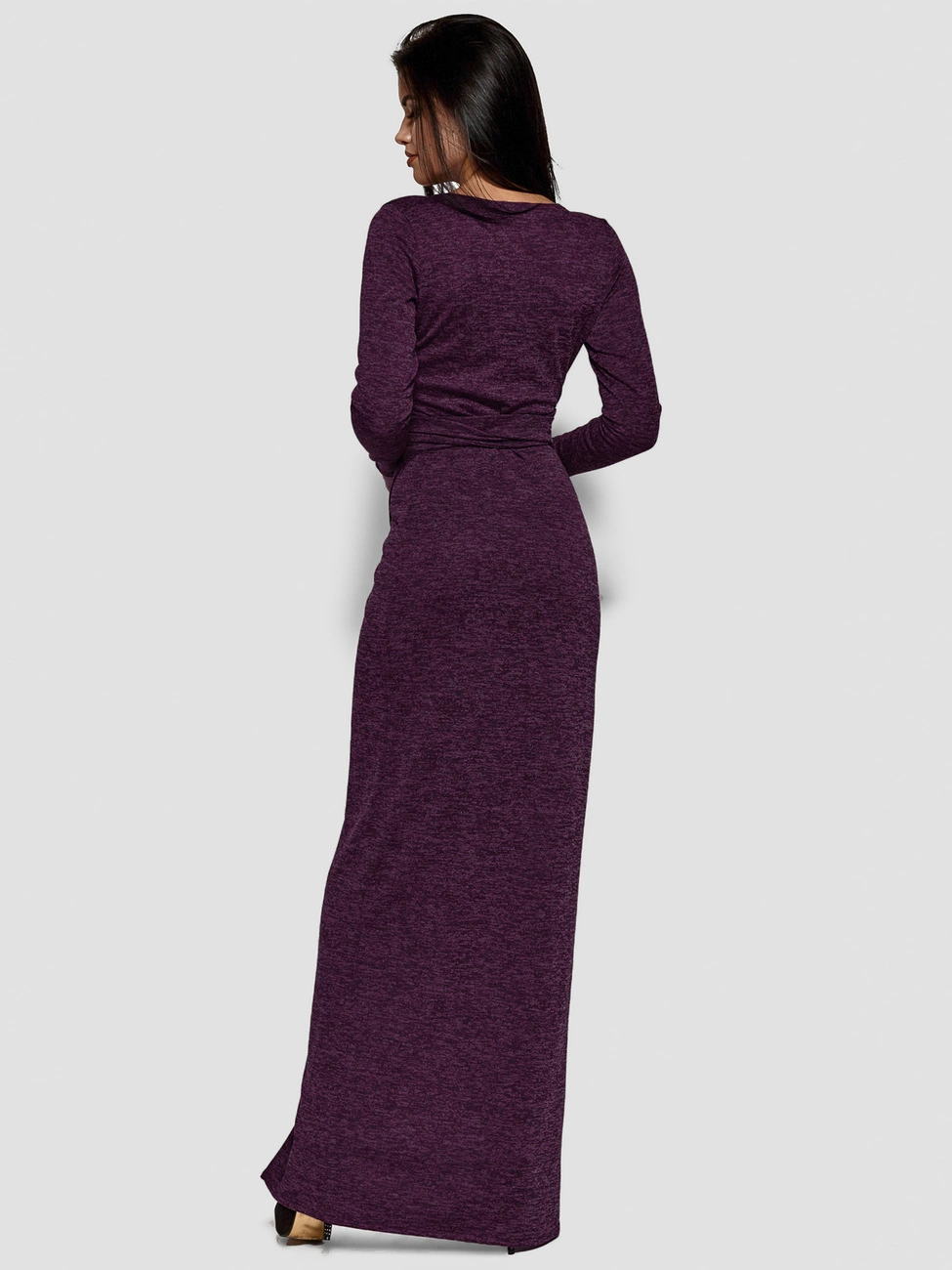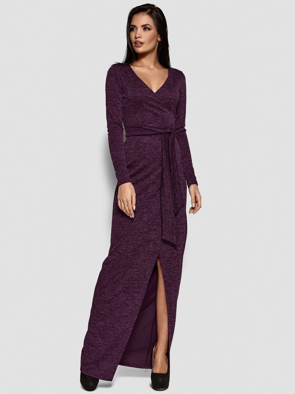 Платье с запахом из эластичного меланжевого трикотажа макси длины, глубокое декольте, длинный рукав, завязывается на длинный пояс-бант
