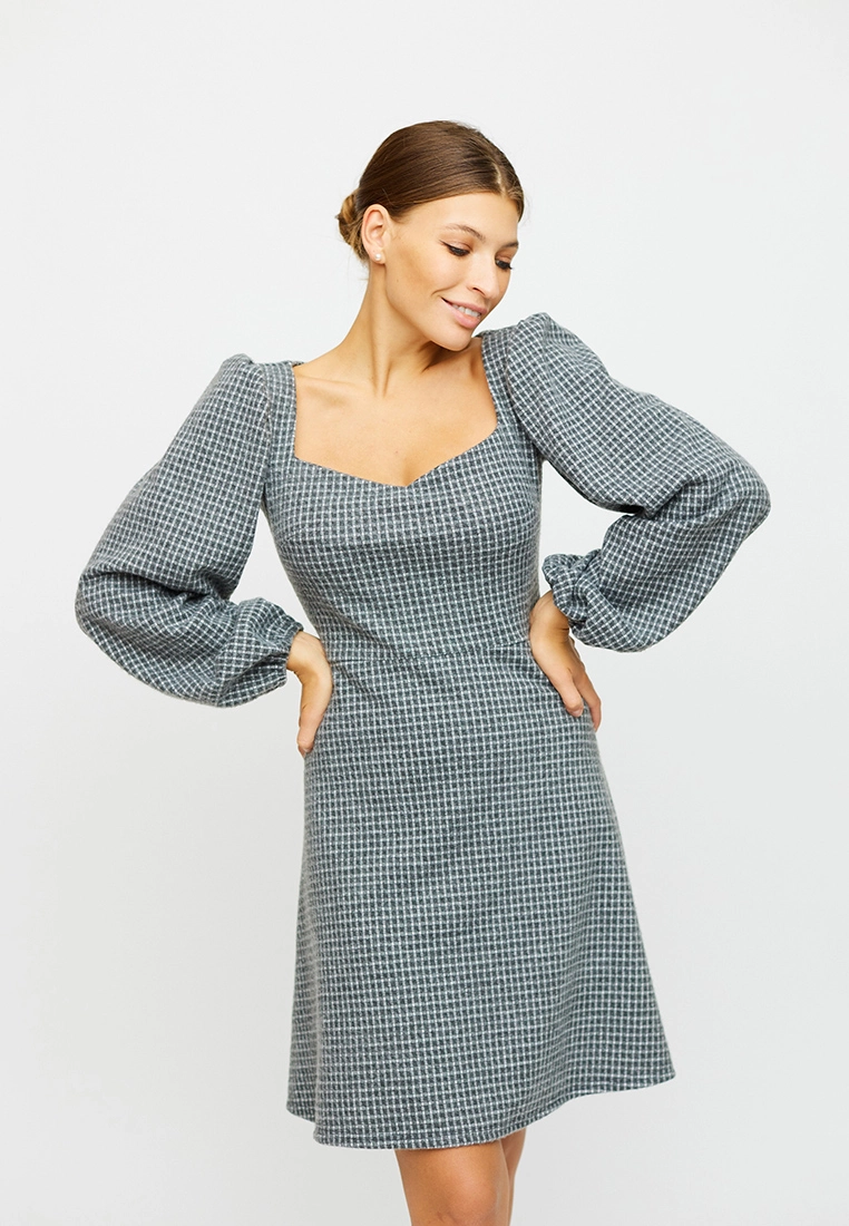 Платье мини из тянущейся фактурной ткани. Глубокое фигурное декольте, отрезная линия талии, юбка полусолнце, рукав широкий со сборкой по плечу