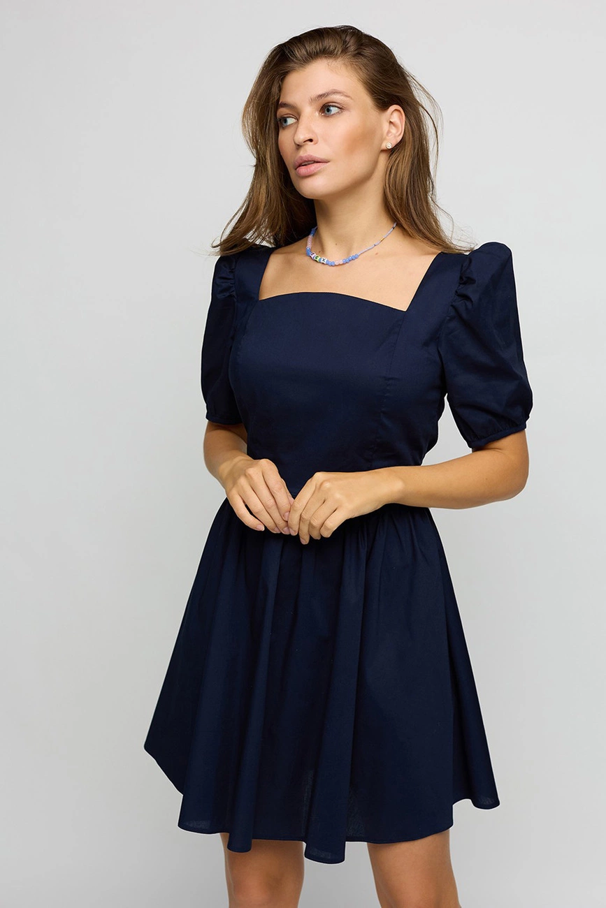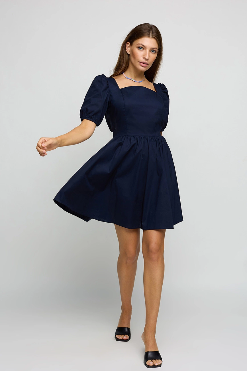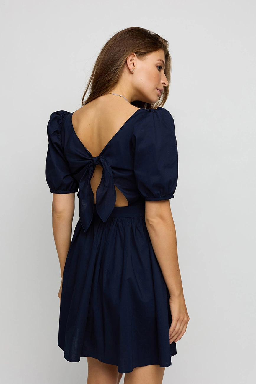 Платье длины мини из легкой рубашечной ткани. Открытая спина с завязкой, юбка полу-солнце; застежка: змейка