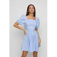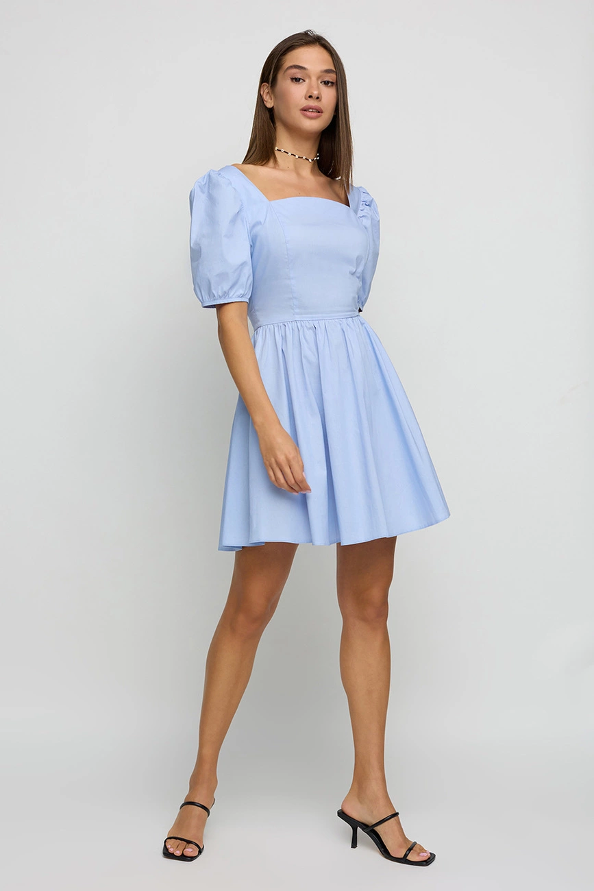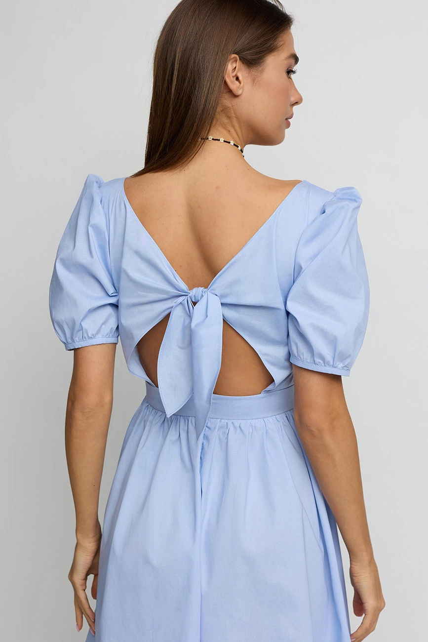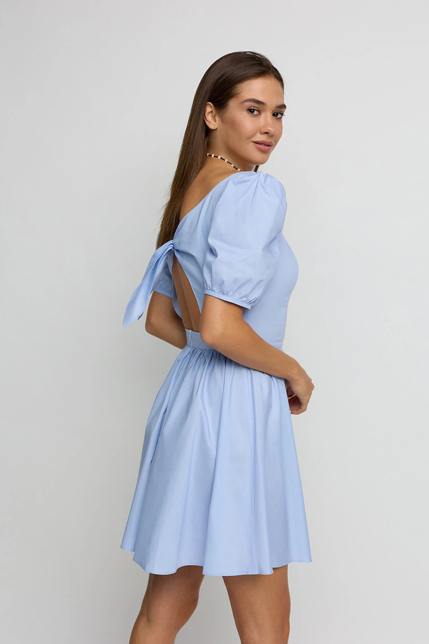 Платье длины мини из легкой рубашечной ткани. Открытая спина с завязкой, юбка полу-солнце; застежка: змейка