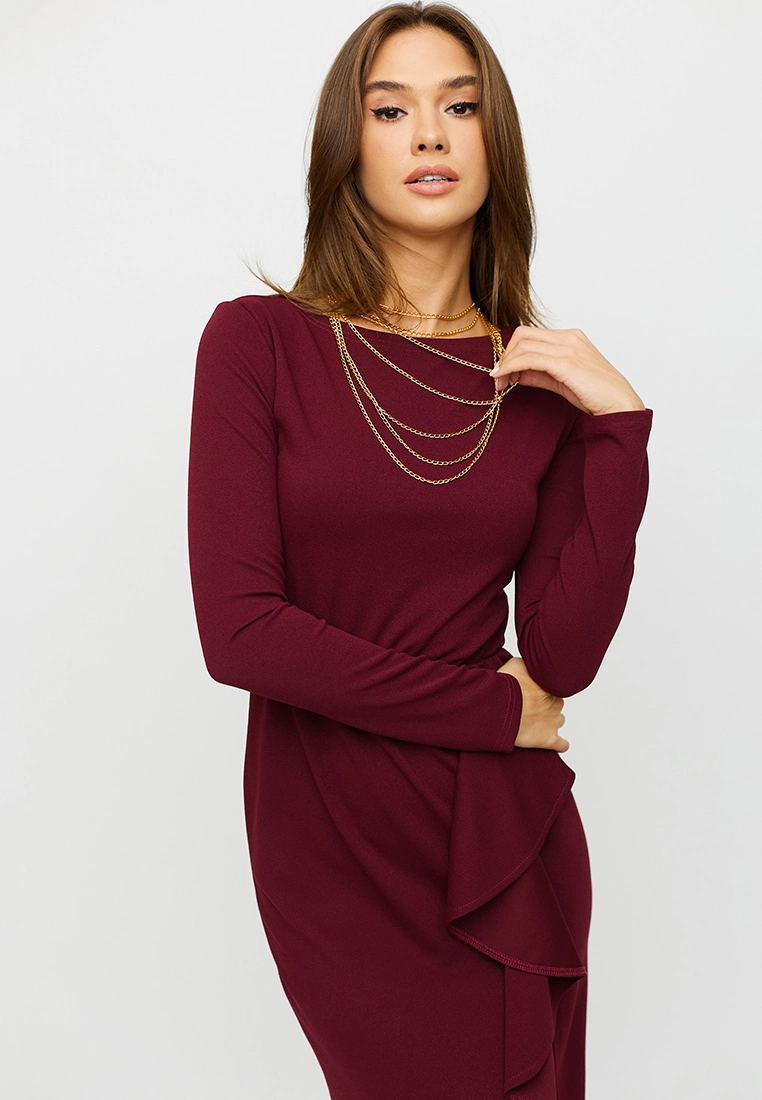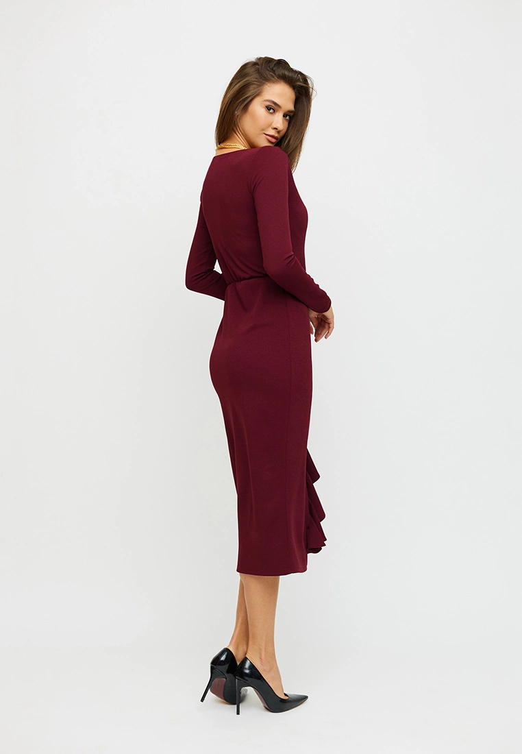 Платье миди из эластичного фактурного трикотажа, длинный рукав, свободный верх, талия на резинке, глубокий разрез декорирован воланом