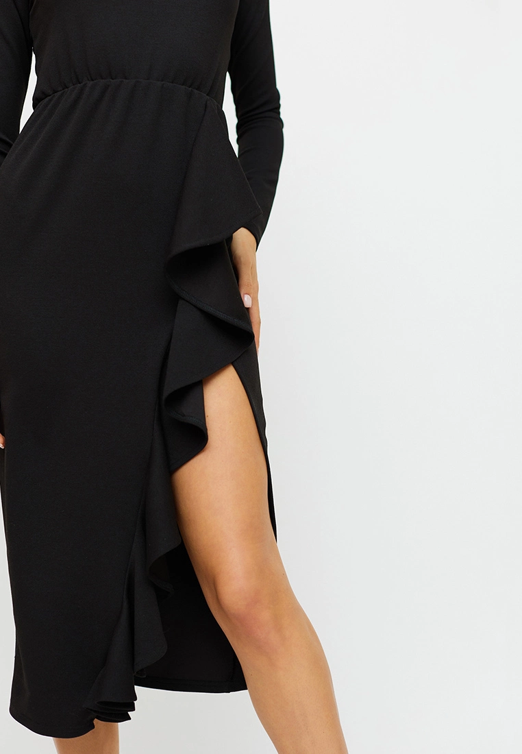 Платье миди из эластичного фактурного трикотажа, длинный рукав, свободный верх, талия на резинке, глубокий разрез декорирован воланом