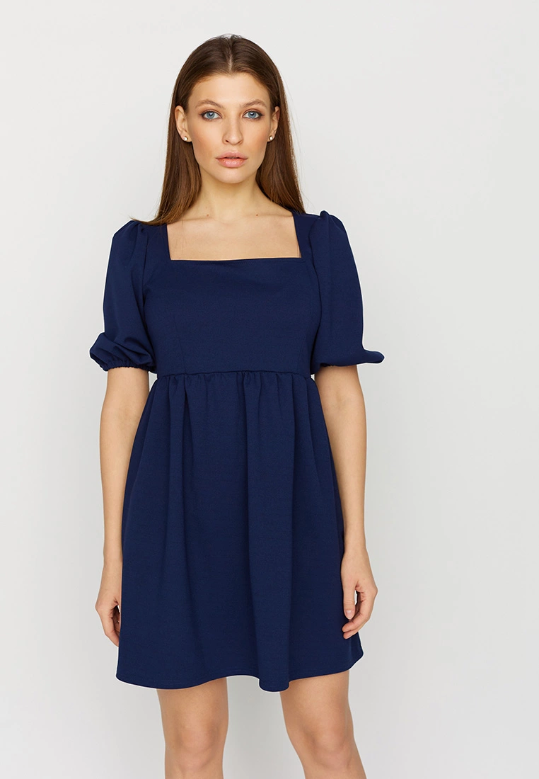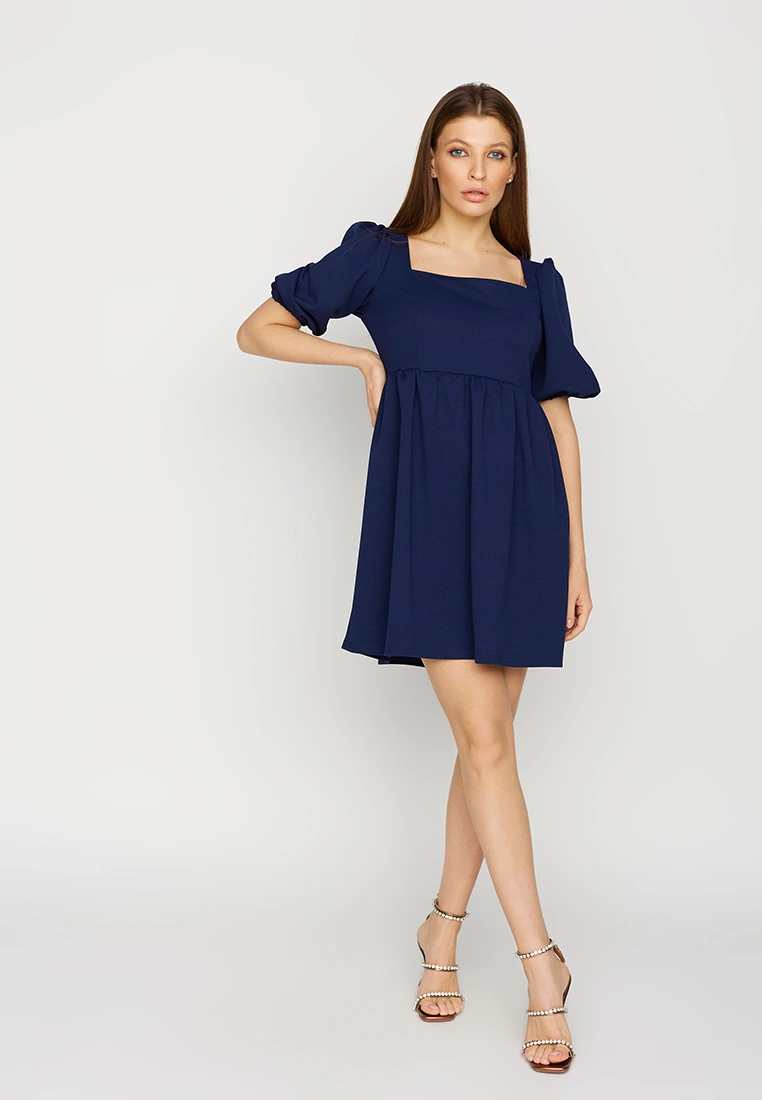 Платье мини из тянущейся фактурной ткани. Глубокое фигурное декольте, отрезная линия талии, юбка полусолнце, рукав широкий со сборкой по плечу