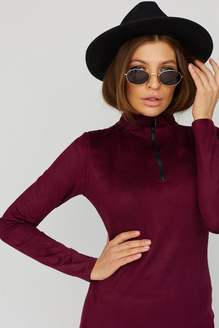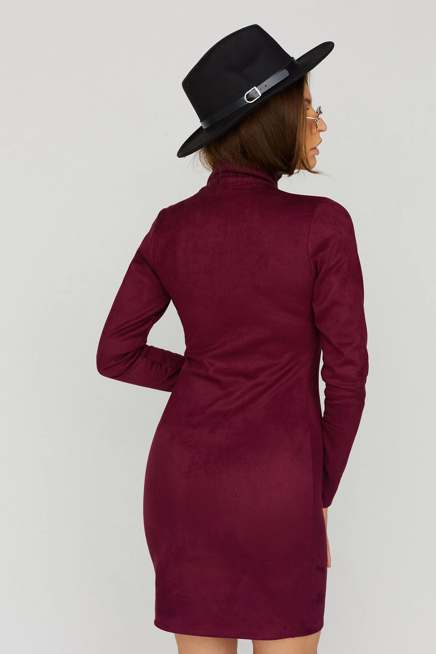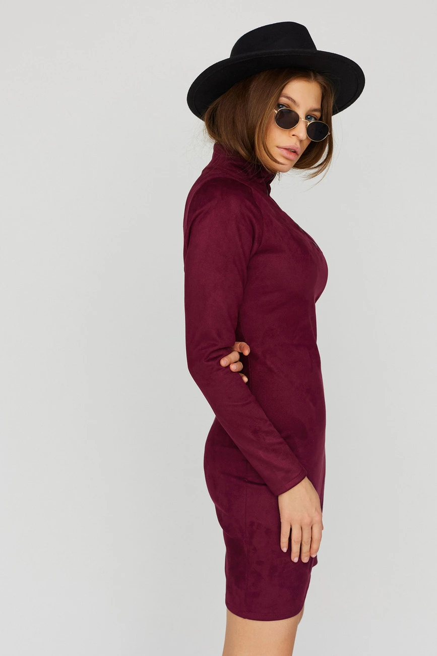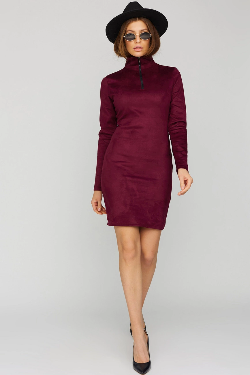 Платье-футляр мини длины из замша, воротник-стойка на молнии, рукав длинный