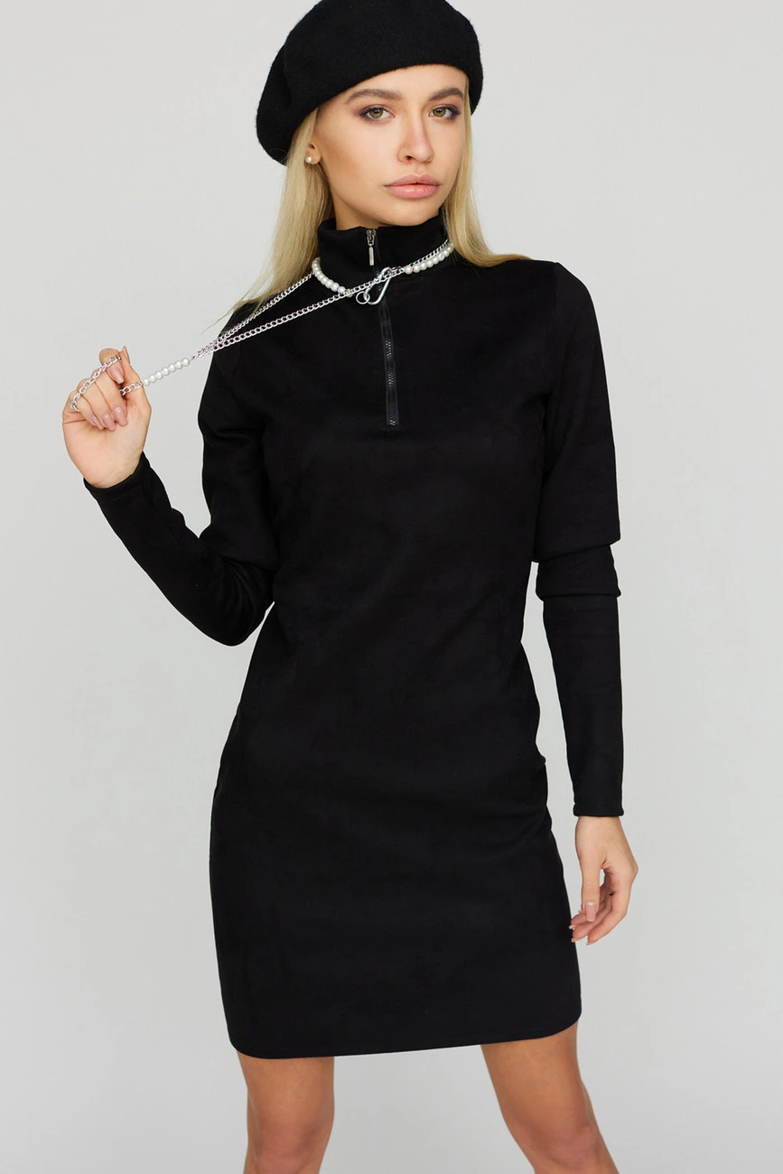 Платье-футляр мини длины из замша, воротник-стойка на молнии, рукав