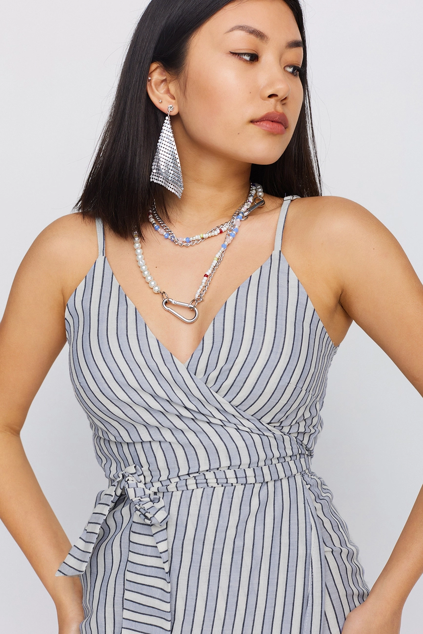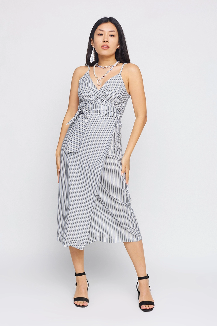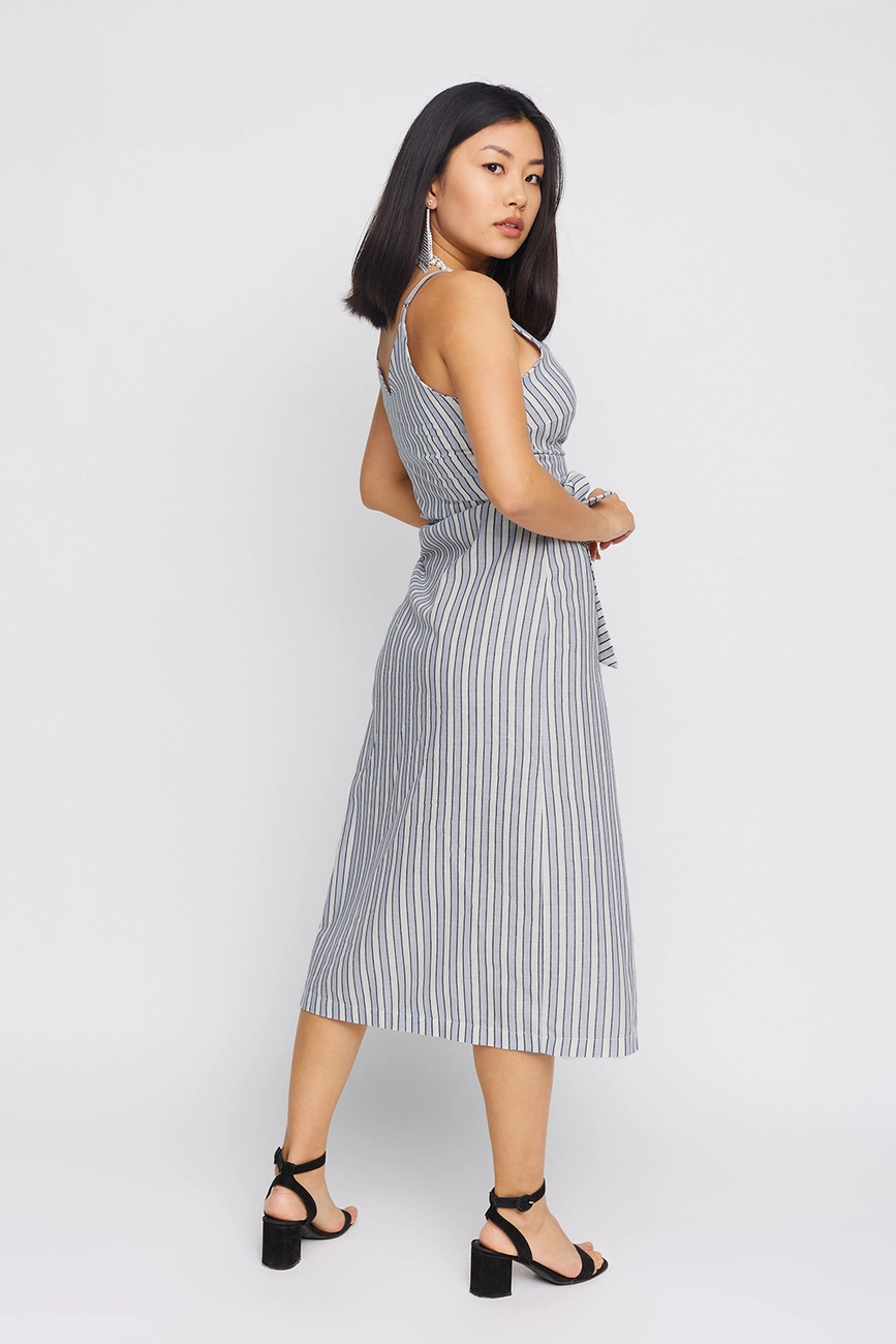 Платье с запахом из тонкого льна; длина миди, глубокое декольте, тонкие бретели с регулятором, пояс вшит