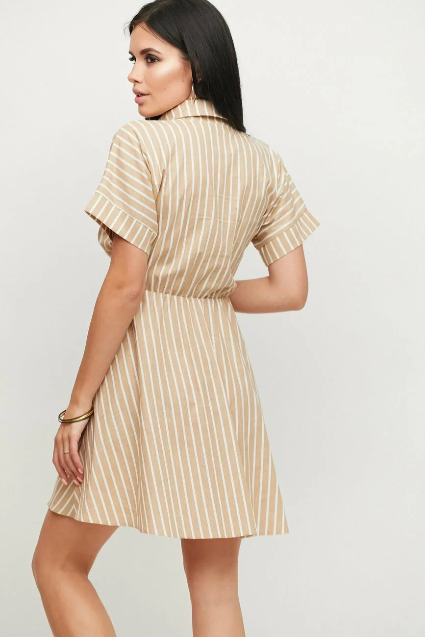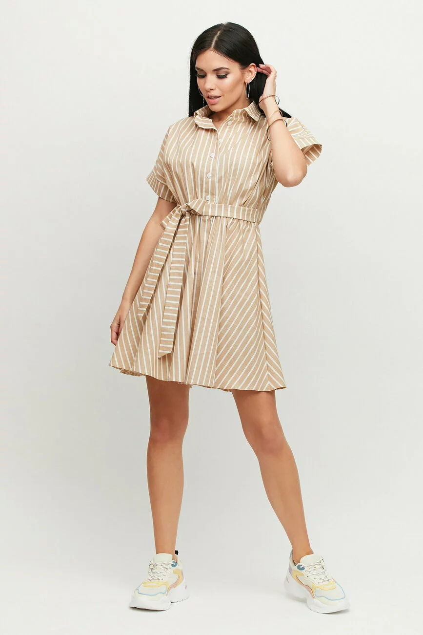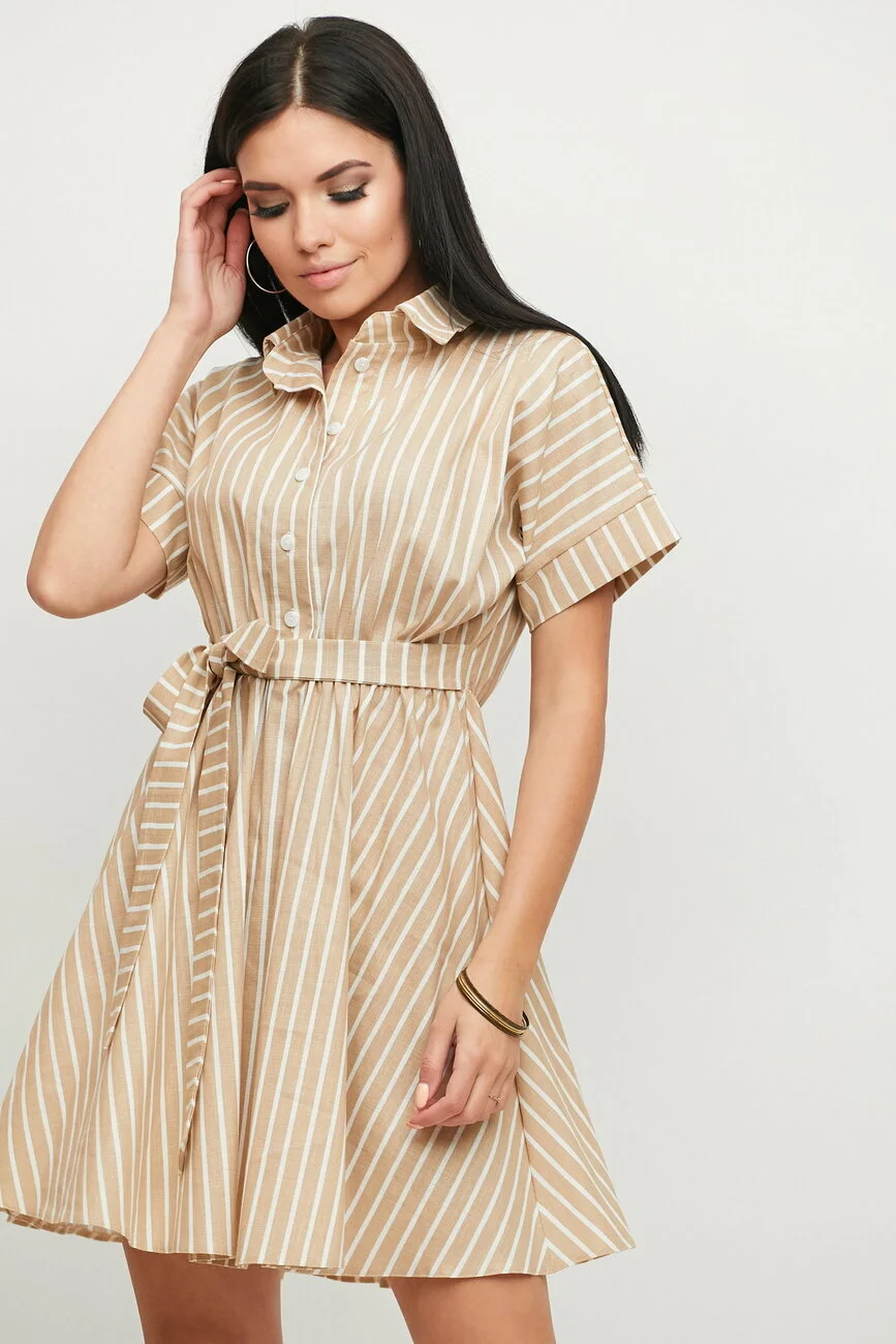 Платье из легкой летней ткани, верх кроя "летучая мышь", горловина с воротником-стойкой, впереди планка с пуговицами, талия собрана на резинку, вшитый пояс, юбка-полусолнце