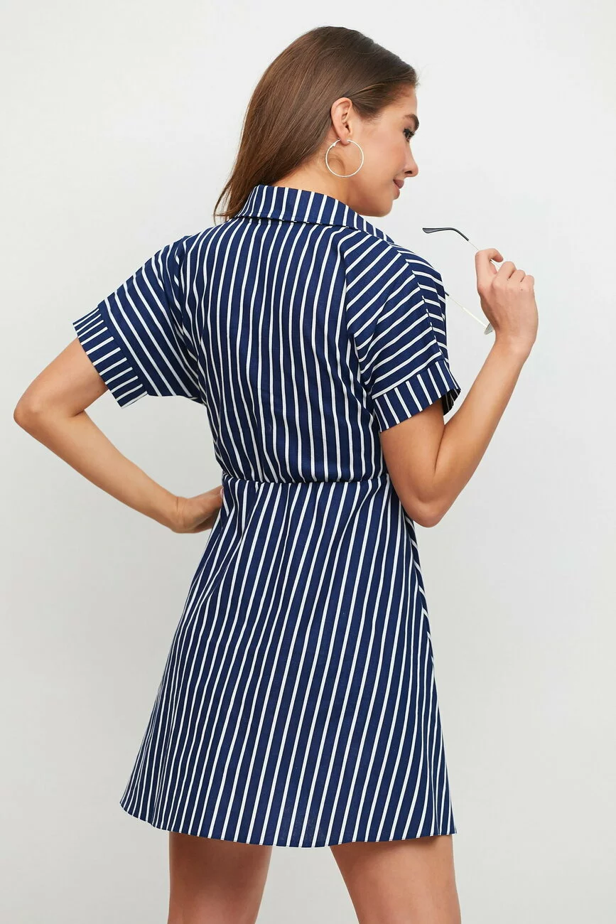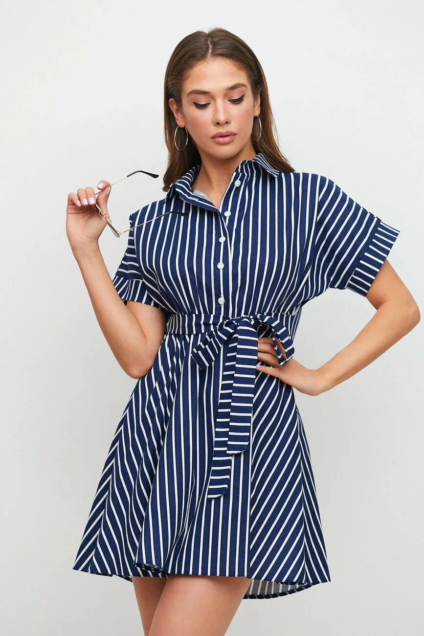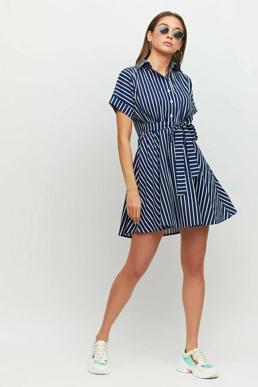 Платье из легкой летней ткани, верх кроя "летучая мышь", горловина с воротником-стойкой, впереди планка с пуговицами, талия собрана на резинку, вшитый пояс, юбка-полусолнце