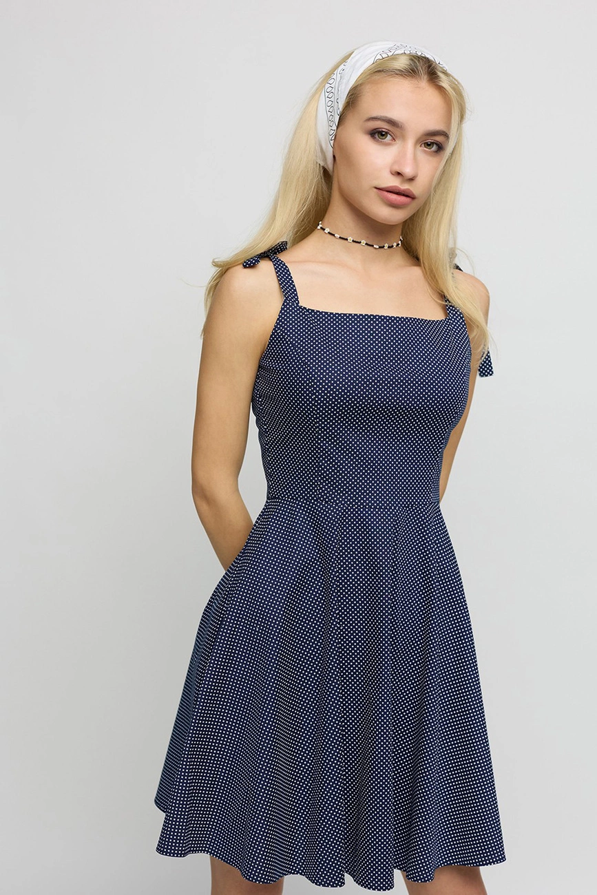 Платье длины мини из стрейч-хлопка; приталеный силуэт, юбка полу-солнце; регулируемые бретели завязываются на банты; застежка: змейка