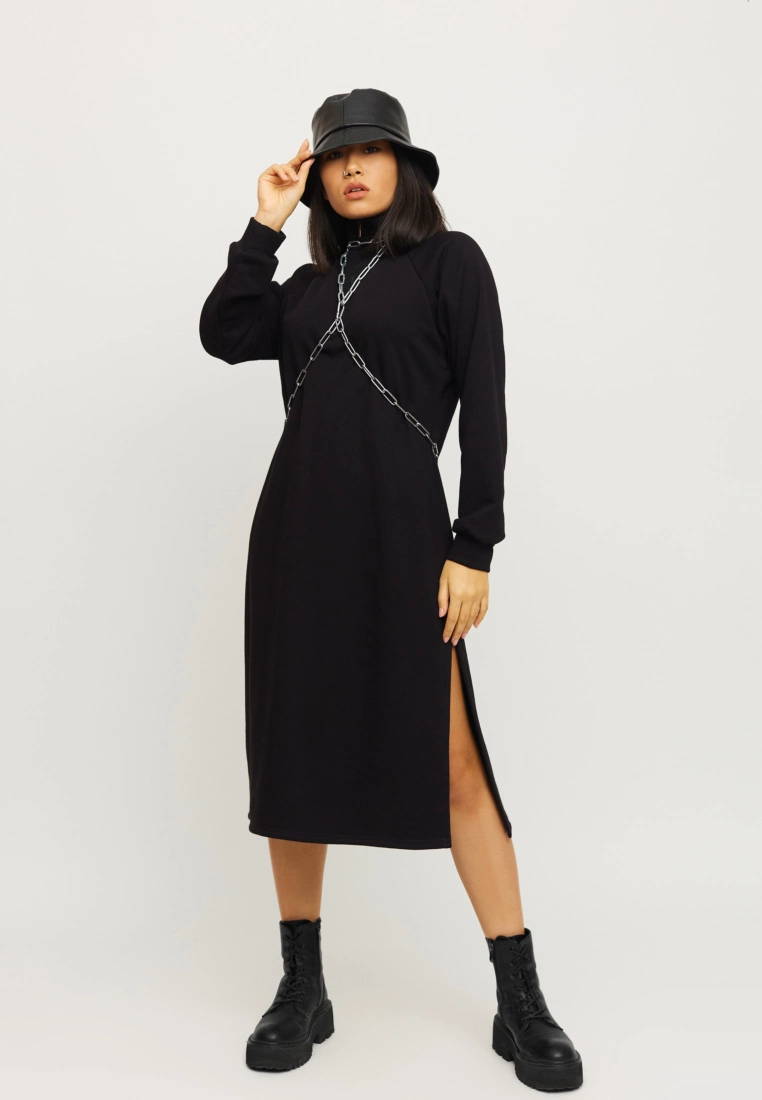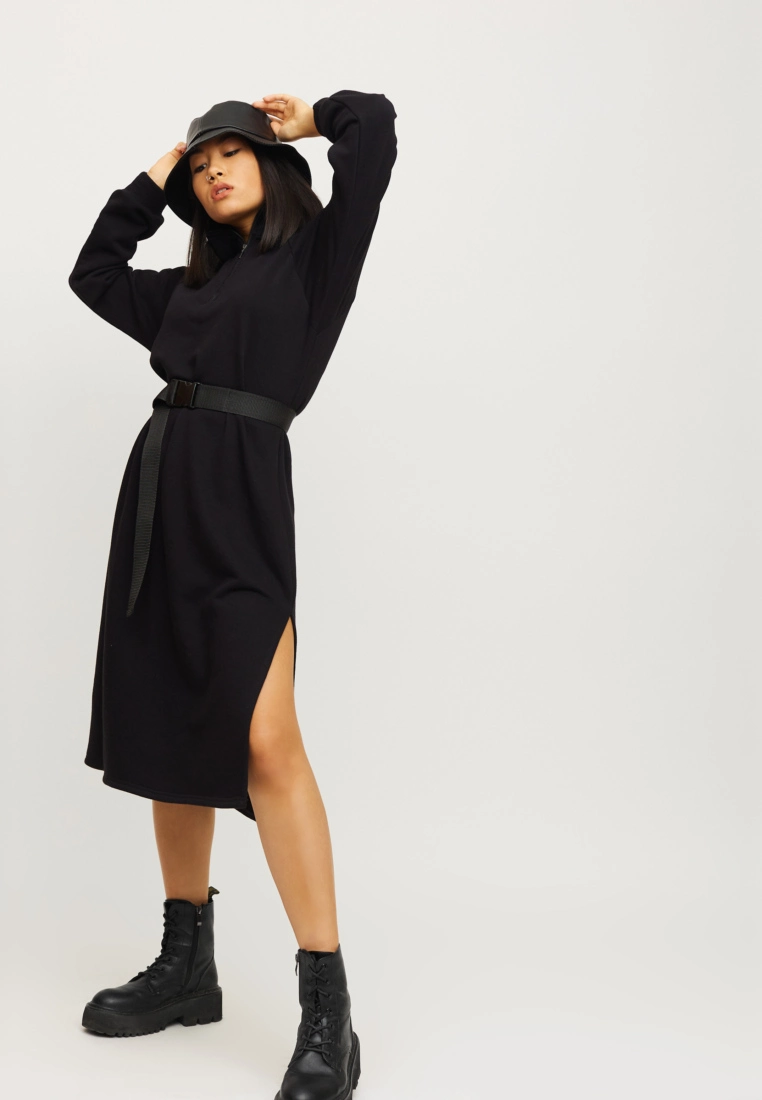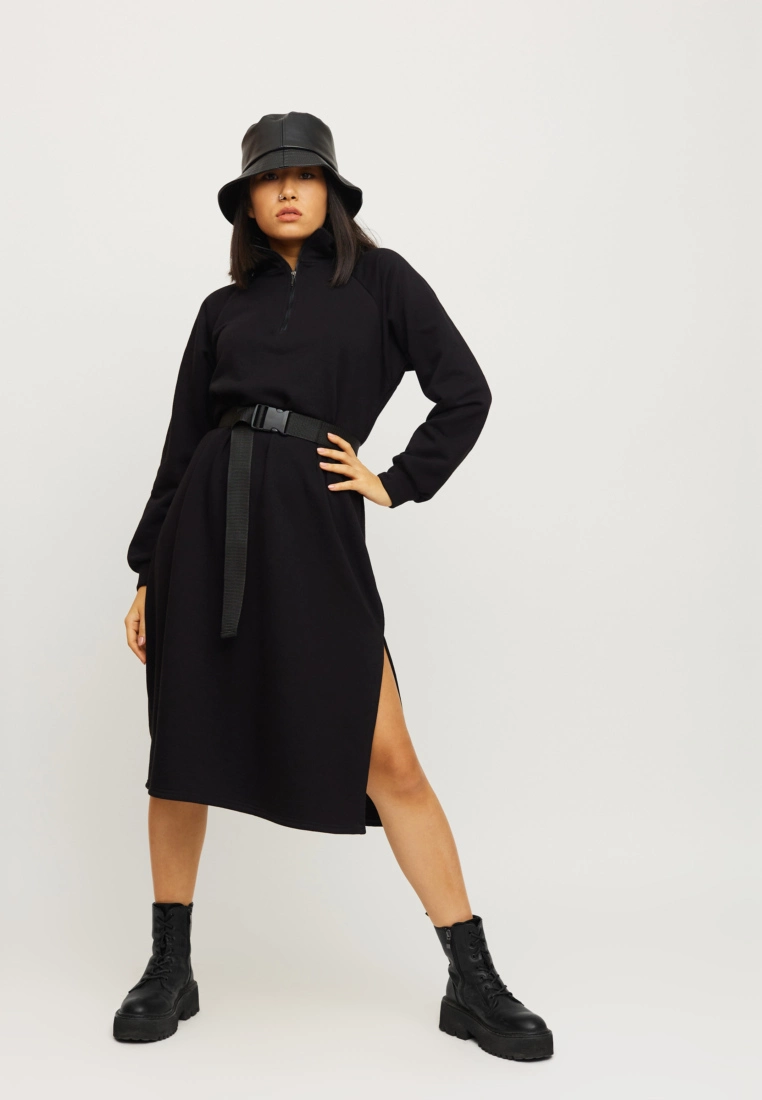 Платье длины миди, свободный крой, рукав: реглан, воротник-стойка со змейкой. В комплекте есть пояс.