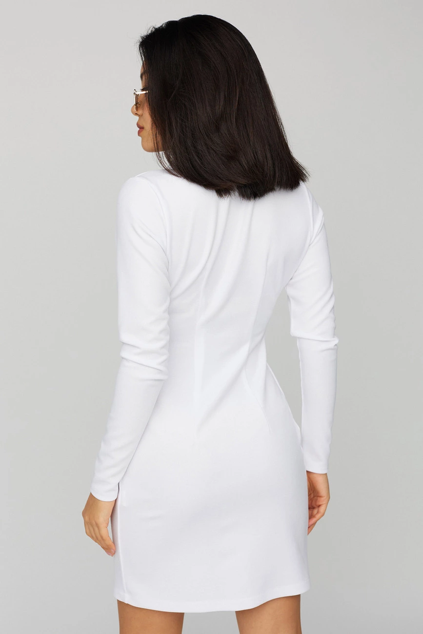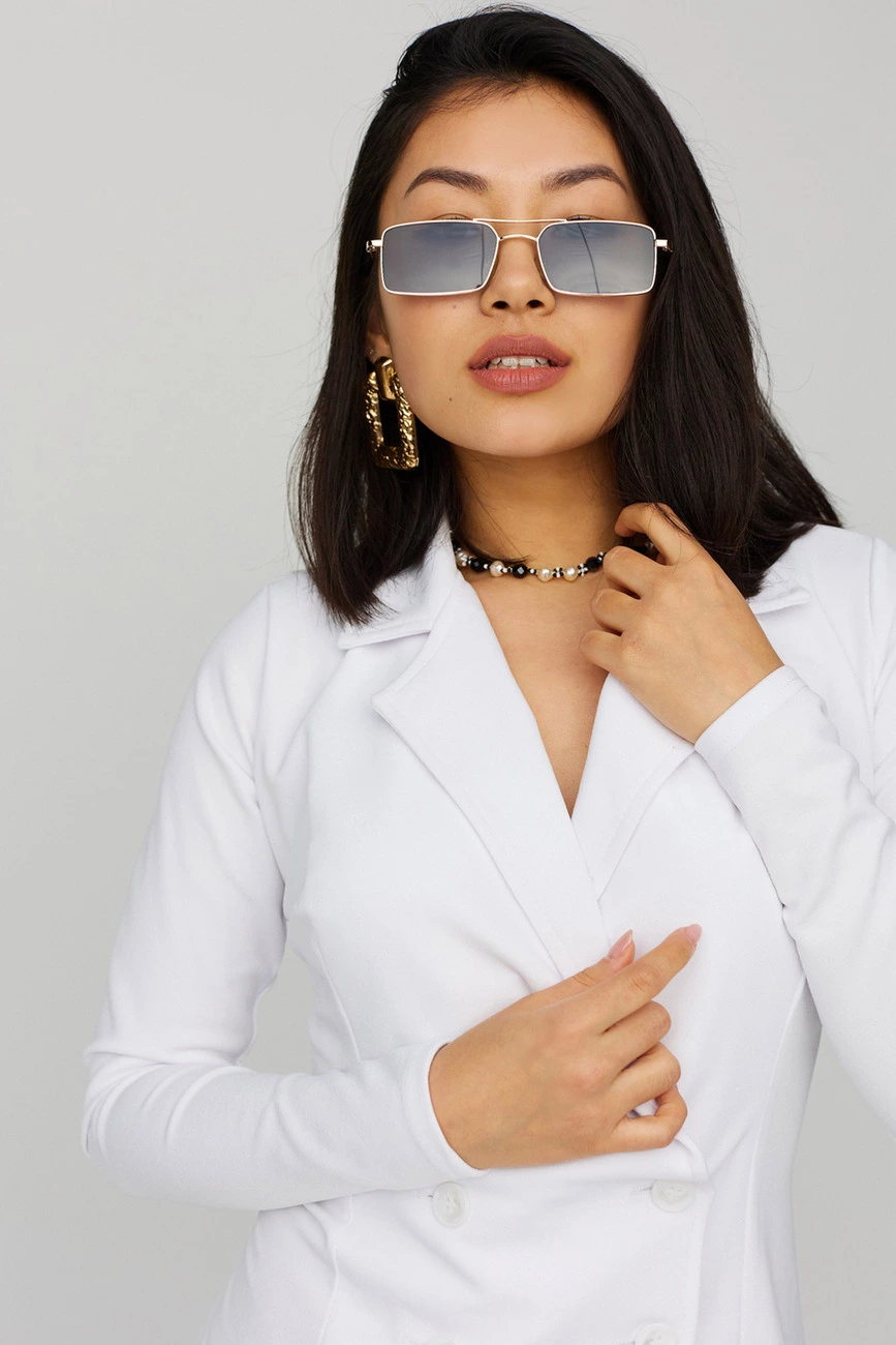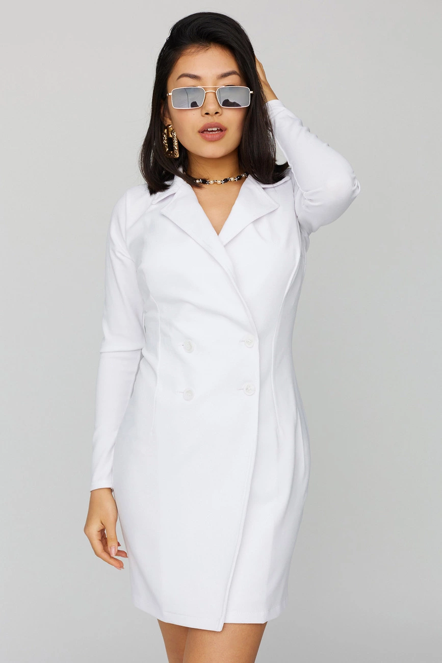Платье-пиджак мини длины прямого кроя из тянущейся фактурной ткани, V-образный вырез, английский воротник; рукав длинный. Застежка: пуговицы.