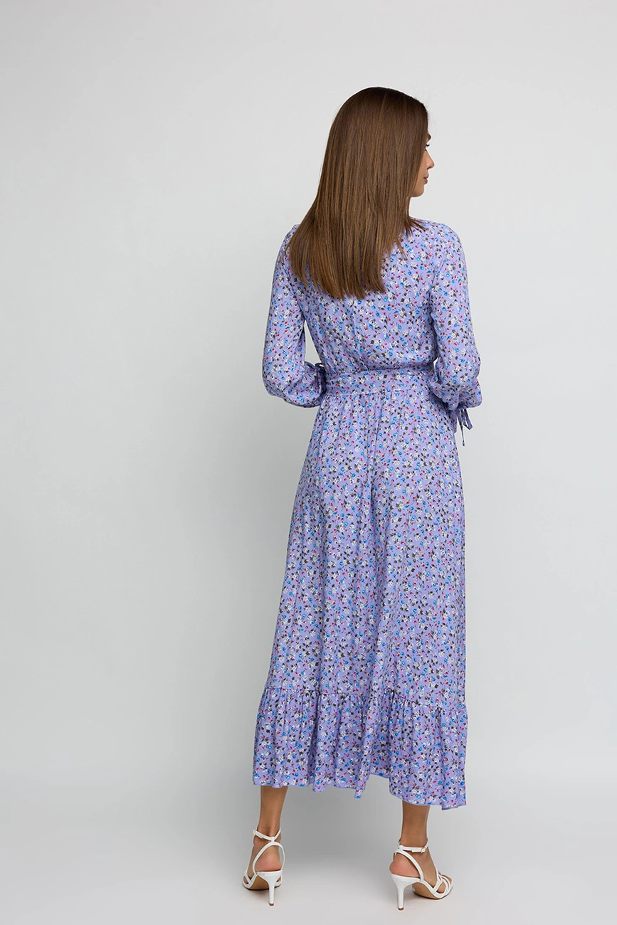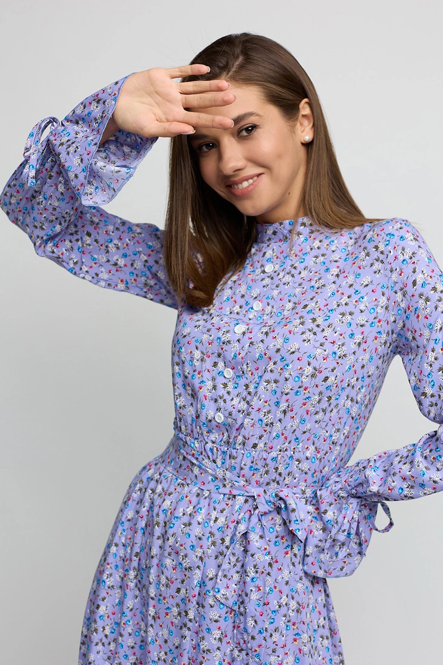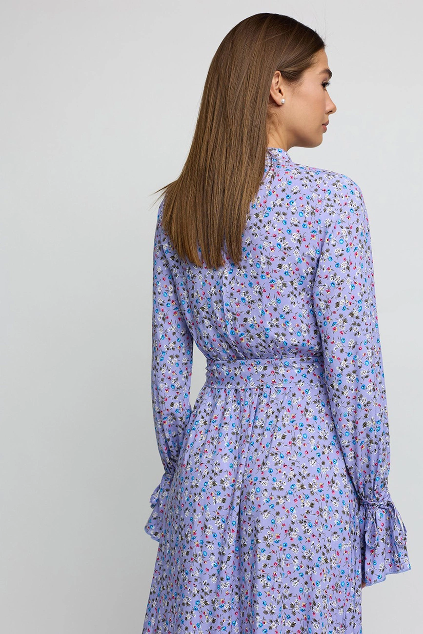 Платье миди с длинными рукавами из легкой летней ткани с отрезной линией талии, верх с фальш-планкой и воротником-стойкой; рукав свободный с завязками; юбка пышная с воланом по низу. Застежка: пуговицы сзади