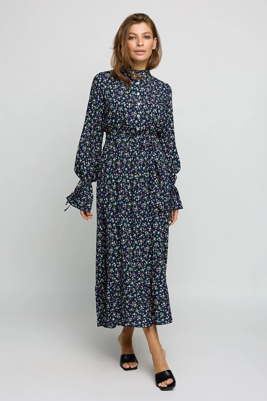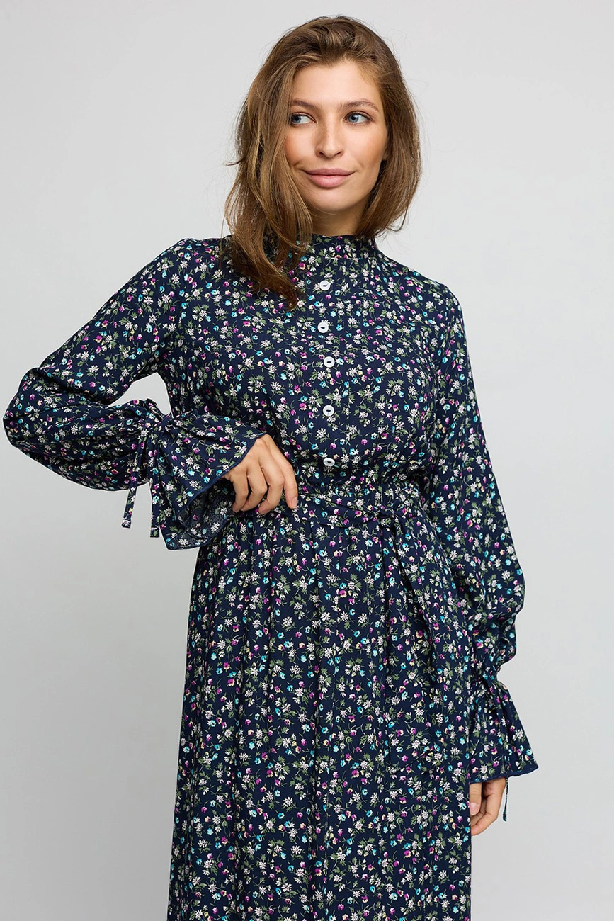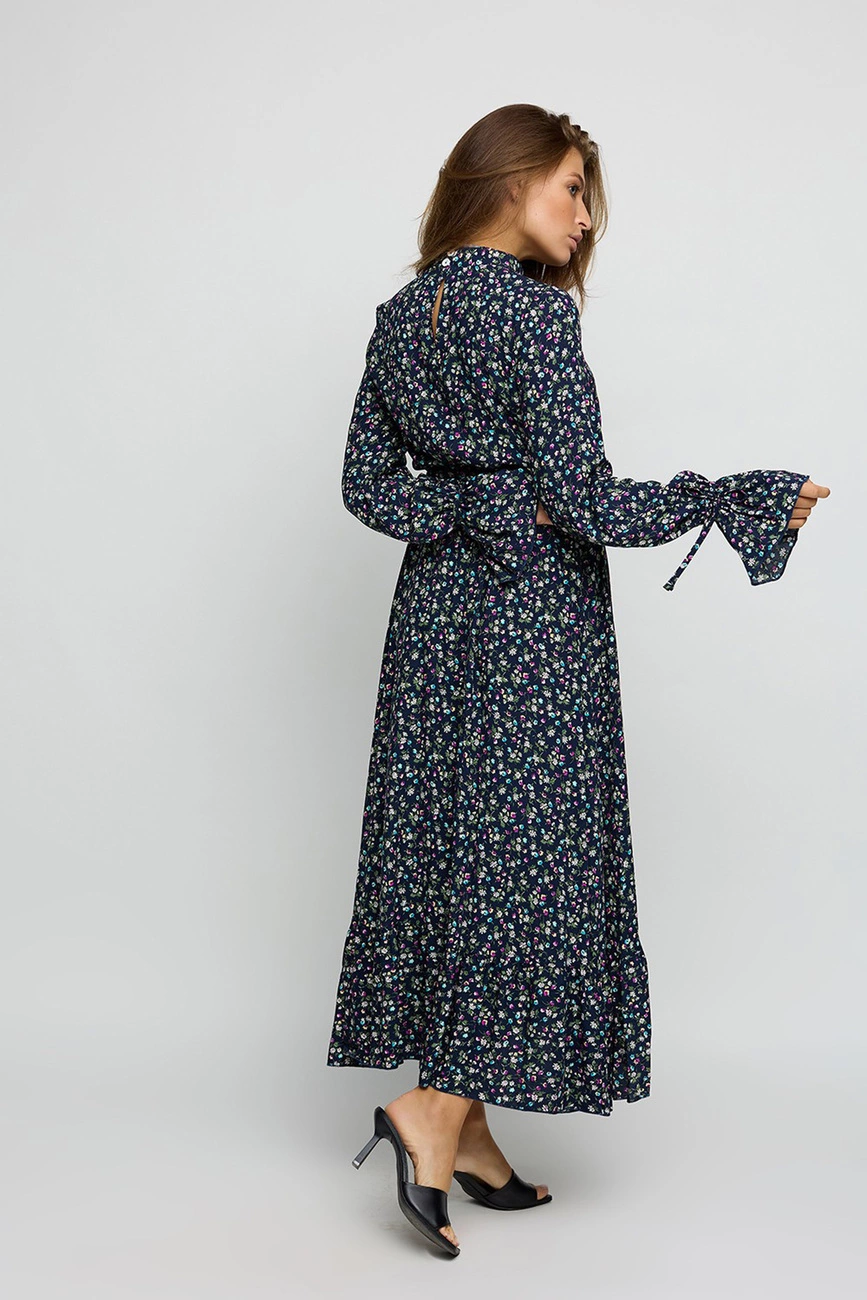 Платье миди с длинными рукавами из легкой летней ткани с отрезной линией талии, верх с фальш-планкой и воротником-стойкой; рукав свободный с завязками; юбка пышная с воланом по низу. Застежка: пуговицы сзади