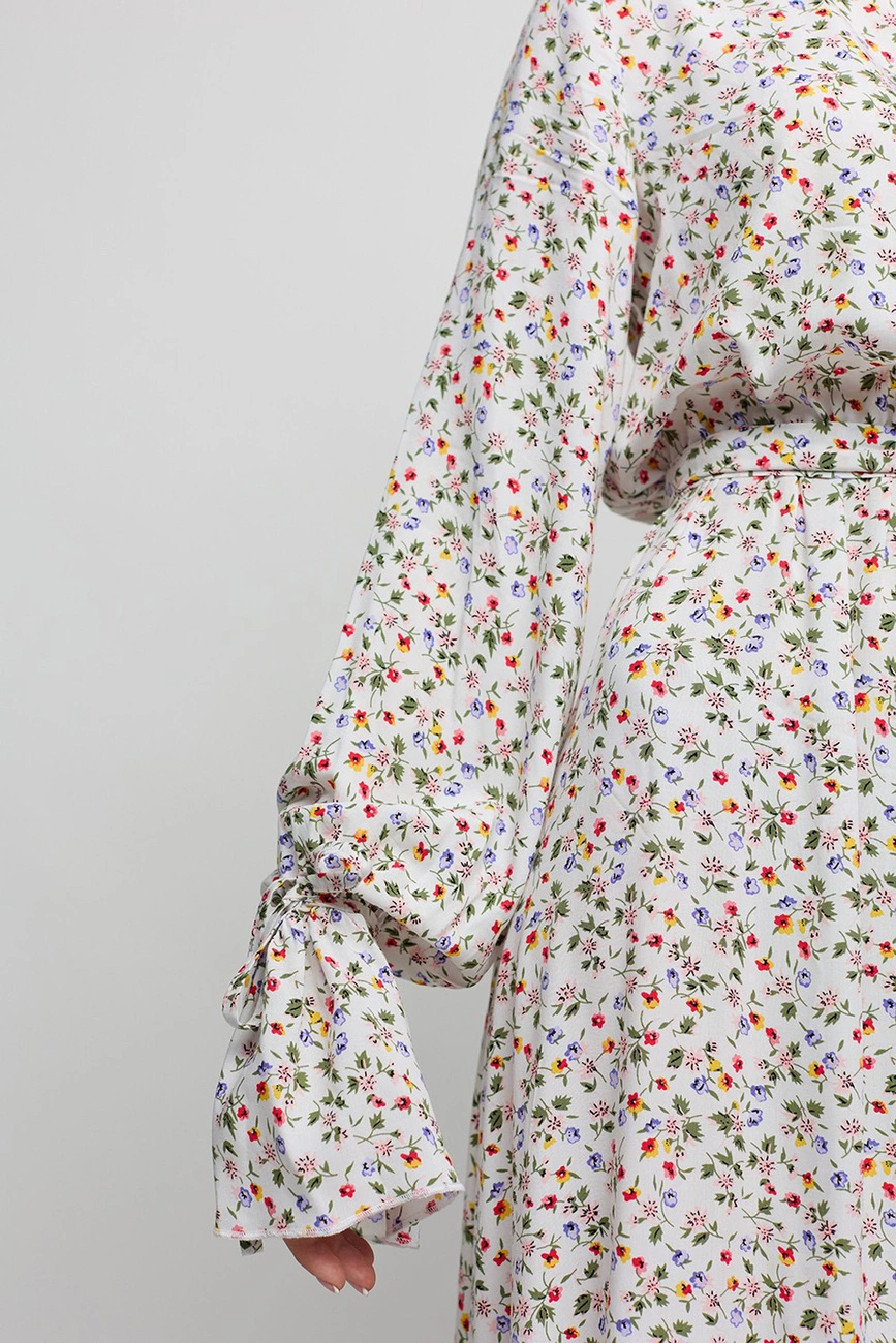 Платье миди с длинными рукавами из легкой летней ткани с отрезной линией талии, верх с фальш-планкой и воротником-стойкой; рукав свободный с завязками; юбка пышная с воланом по низу. Застежка: пуговицы сзади