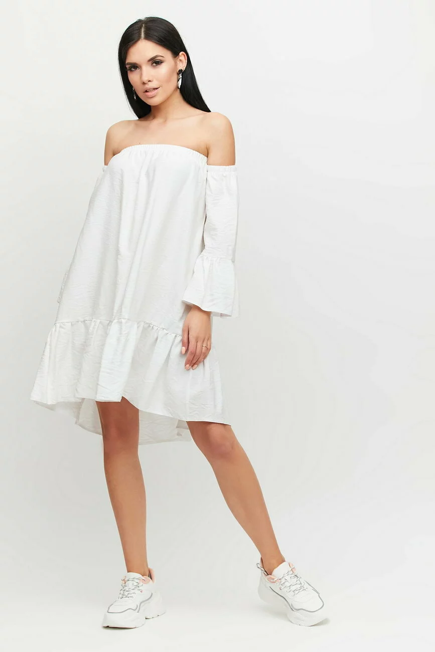 Платье трапецевидного кроя с воланами на рукавах и по низу изделия из приятной на ощупь ткани, плечи открытые