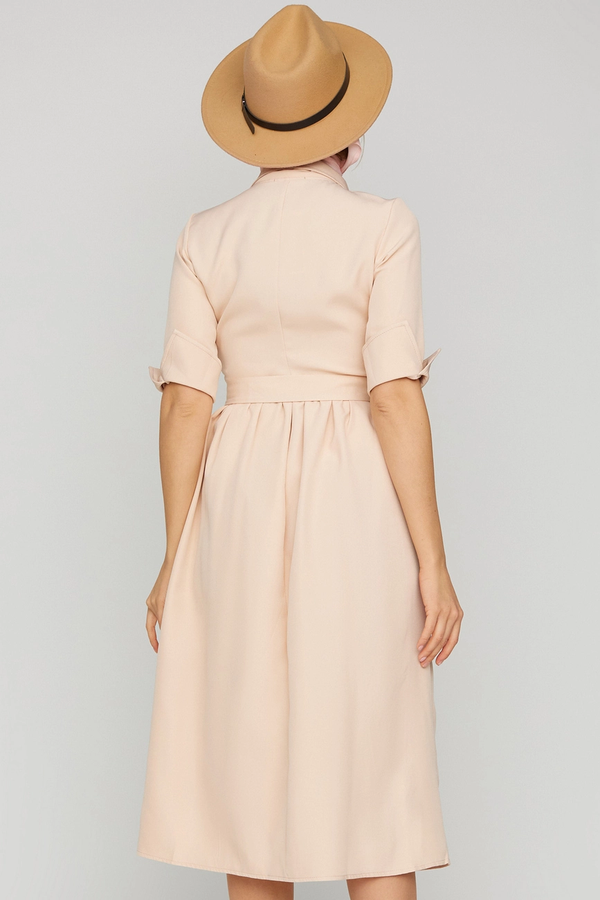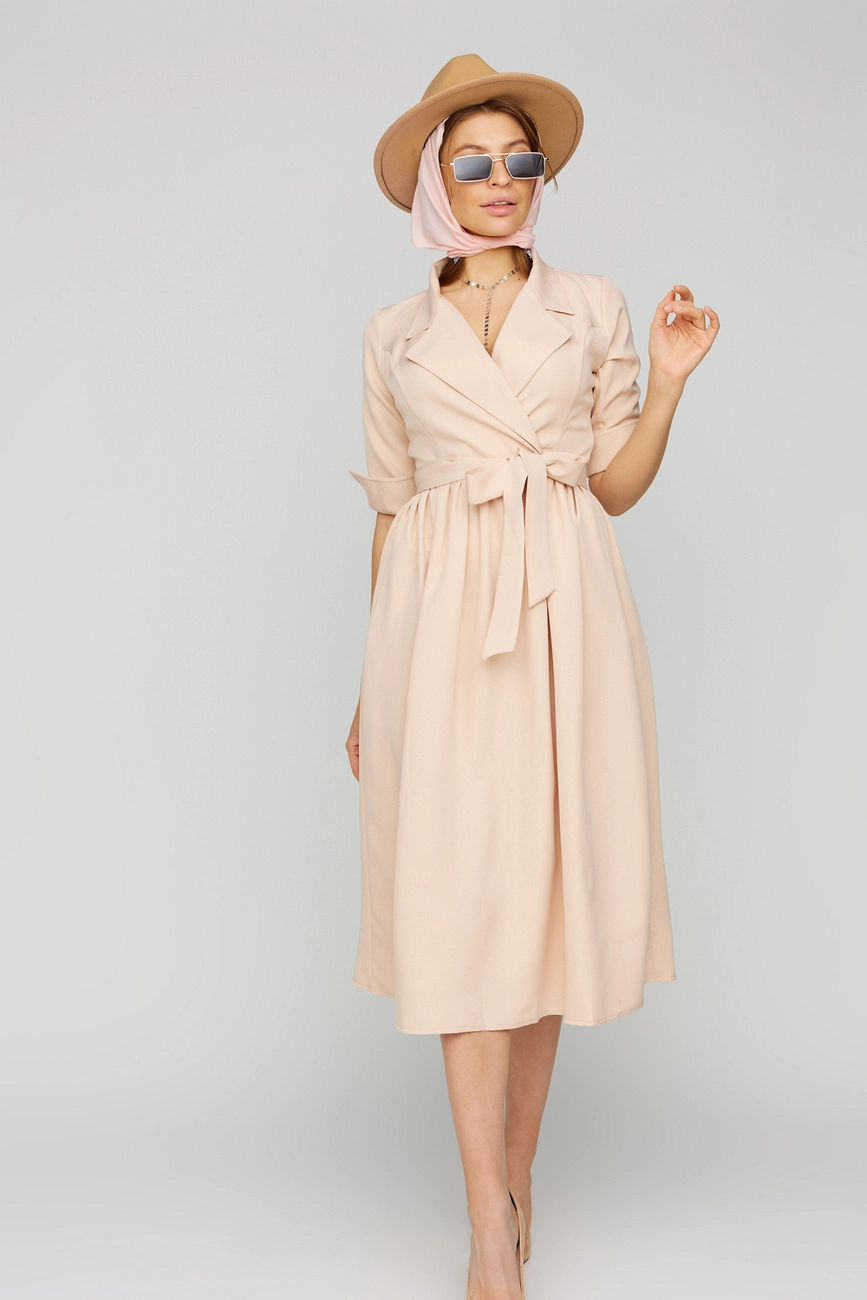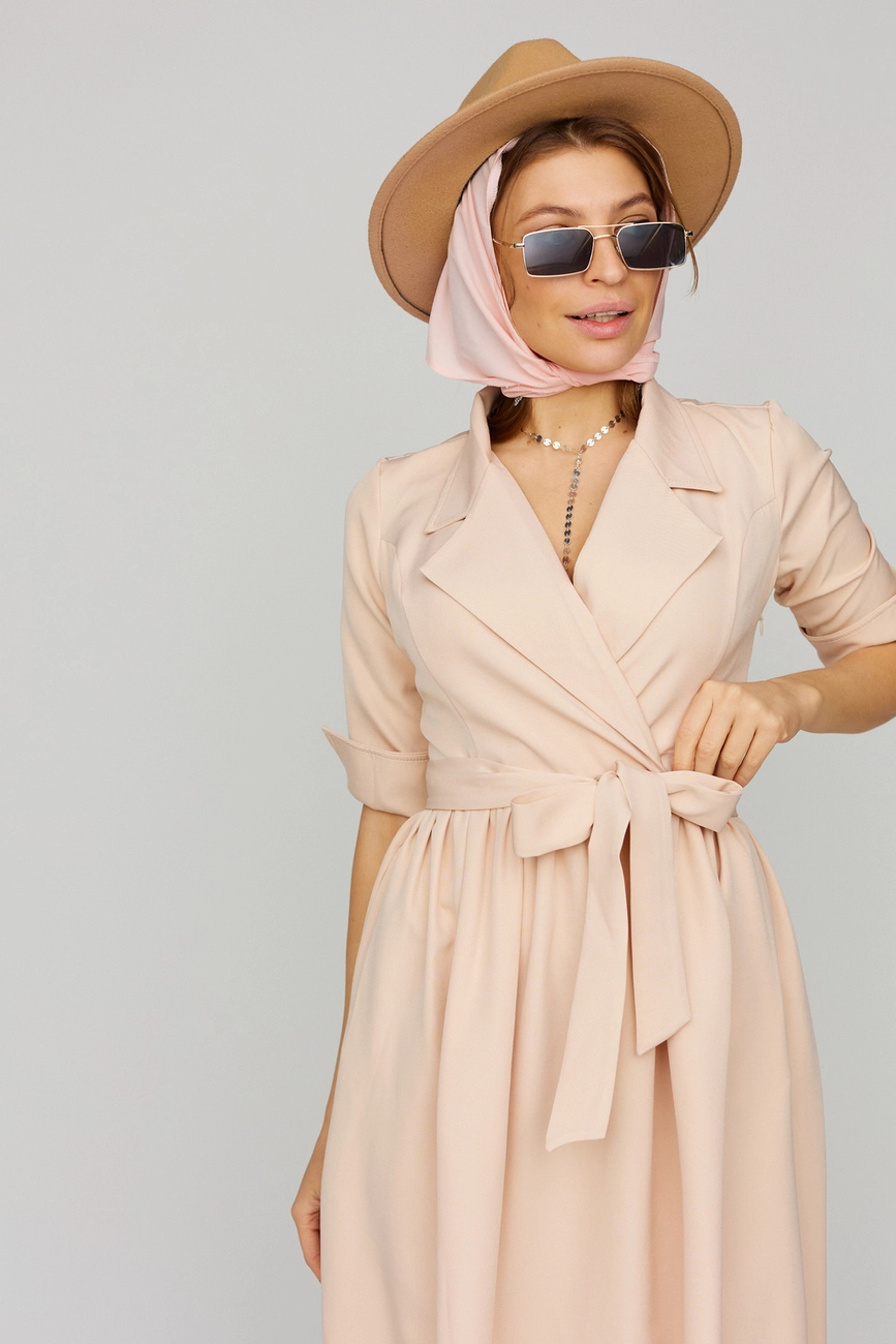 Материал: костюмная ткань Размер: S, M, L Растяжимость ткани: слабая Длина изделия (размер S): 110 см Длина/ширина рукава (размер S): 38/15 см Полуобхват плечи/грудь/талия/бедра (размер S): 36/41/34/64 см Рекомендации по уходу: ручная стирка в прохладной воде Платье средней длины из костюмной ткани, V-образный вырез с английским воротником, имитация запаха, рукава 3/4 с подворачивающимися манжетами, сборка по линии талии, есть карманы, пояс в комплекте. Застежка: потайная молния сбоку
