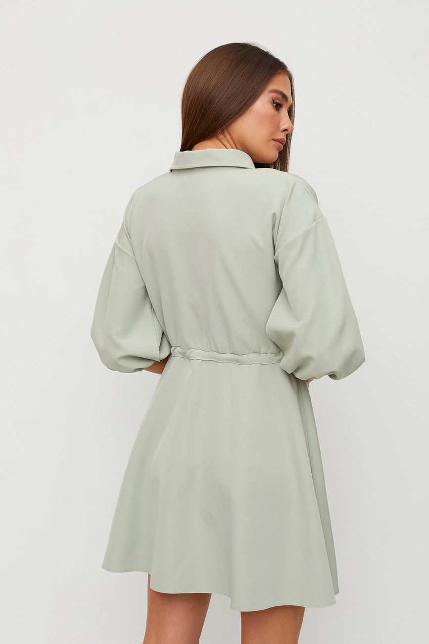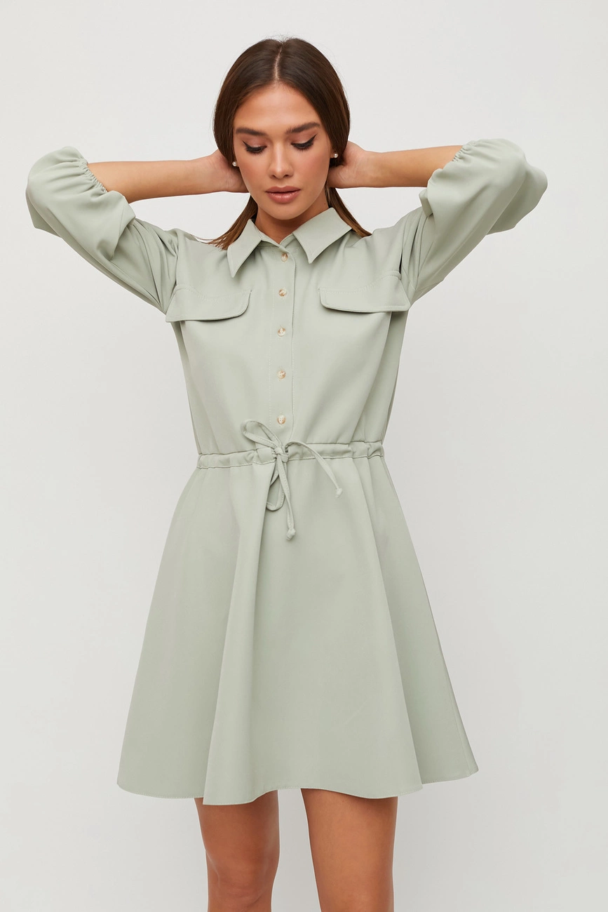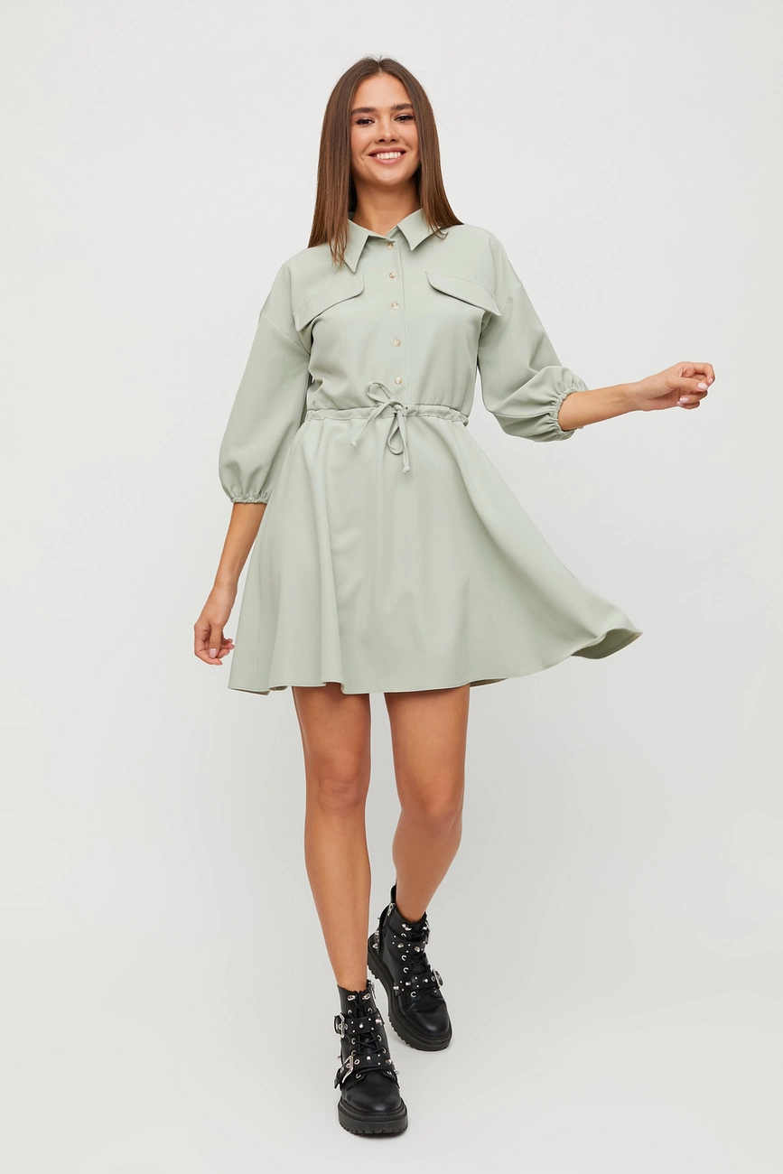Платье мини длины из плотной слегка тянущейся костюмной ткани с отрезной талией, воротник-стойка, спущенная линия плеча, рукав широкий 3/4 собран на резинку, впереди планка с пуговицами, карманы-клапаны, юбка клеш