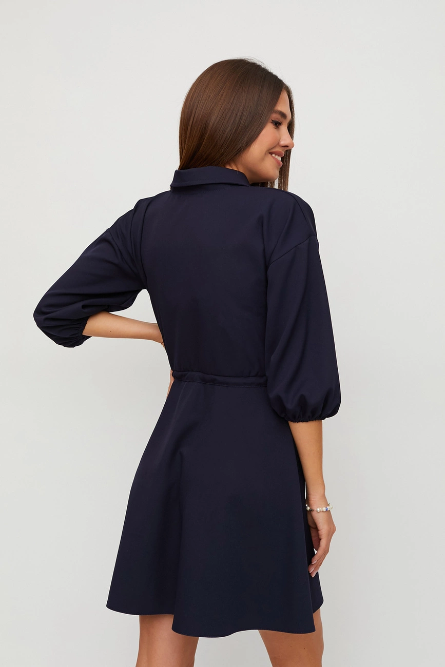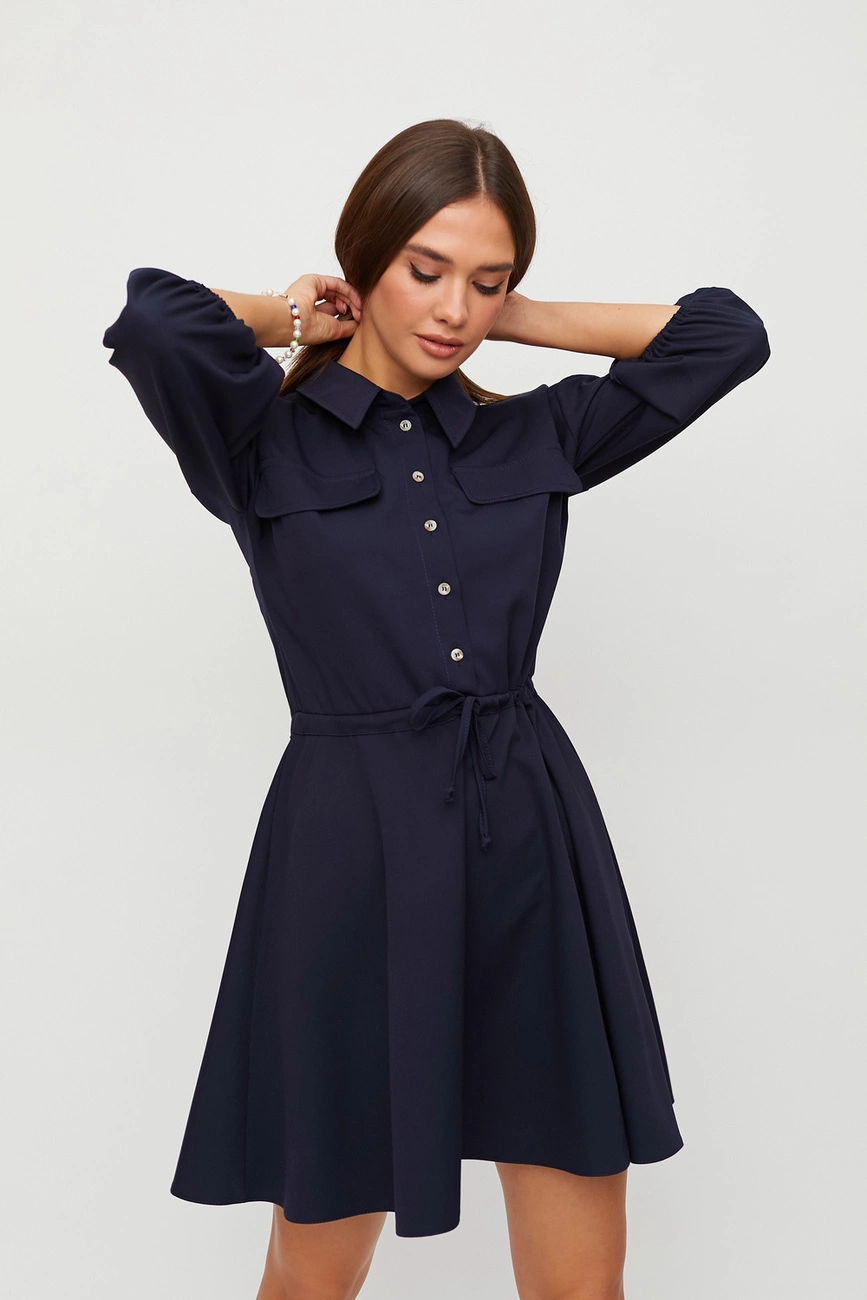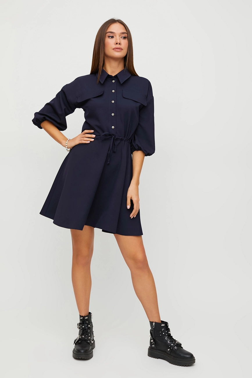 Платье мини длины из плотной слегка тянущейся костюмной ткани с отрезной талией, воротник-стойка, спущенная линия плеча, рукав широкий 3/4 собран на резинку, впереди планка с пуговицами, карманы-клапаны, юбка клеш