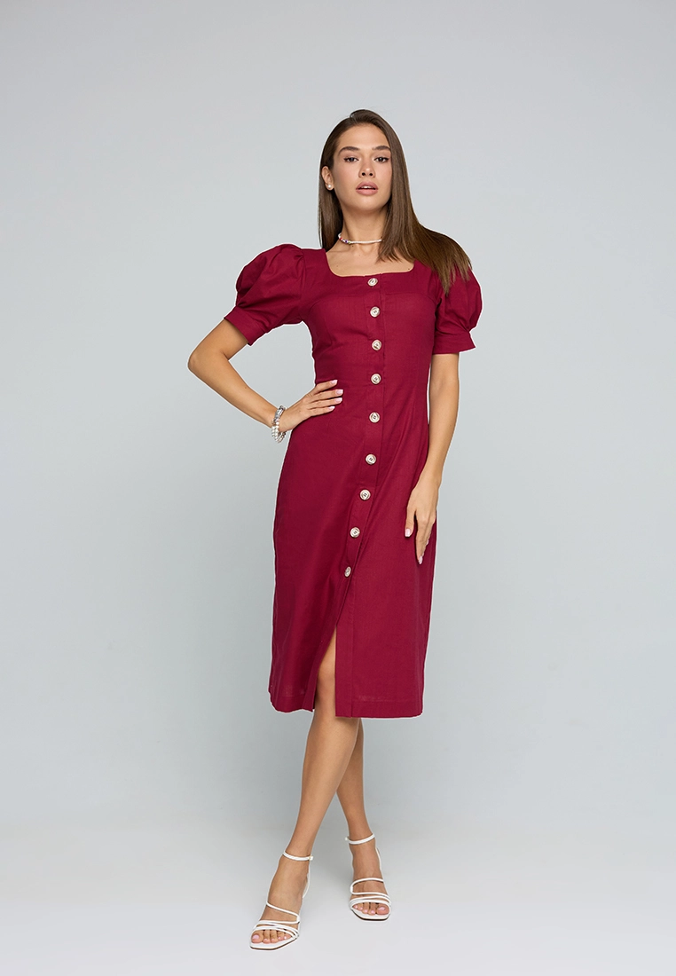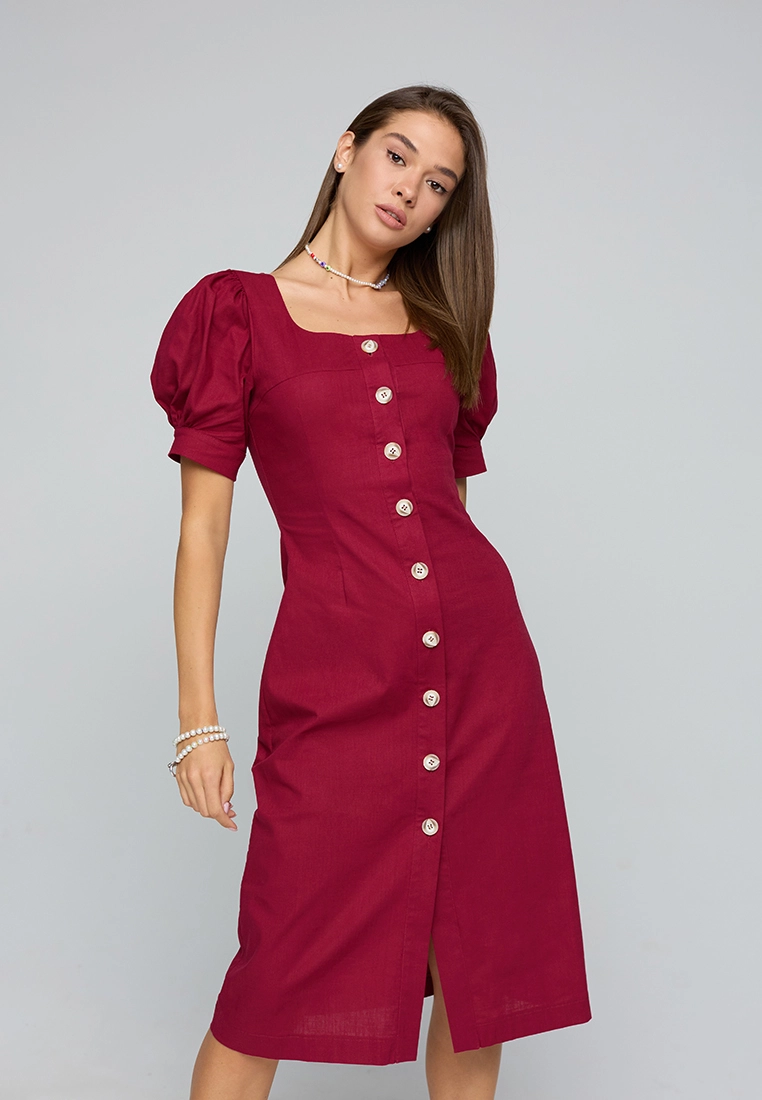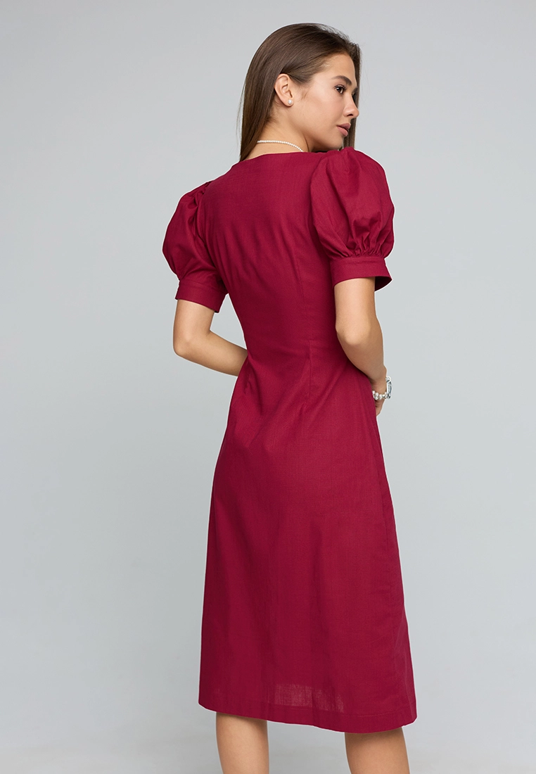 Платье длины миди из легкой летней ткани; приталенный крой; короткий, широкий рукав собран на резинку; по груди фигурный вырез; сзади разрез-шлица