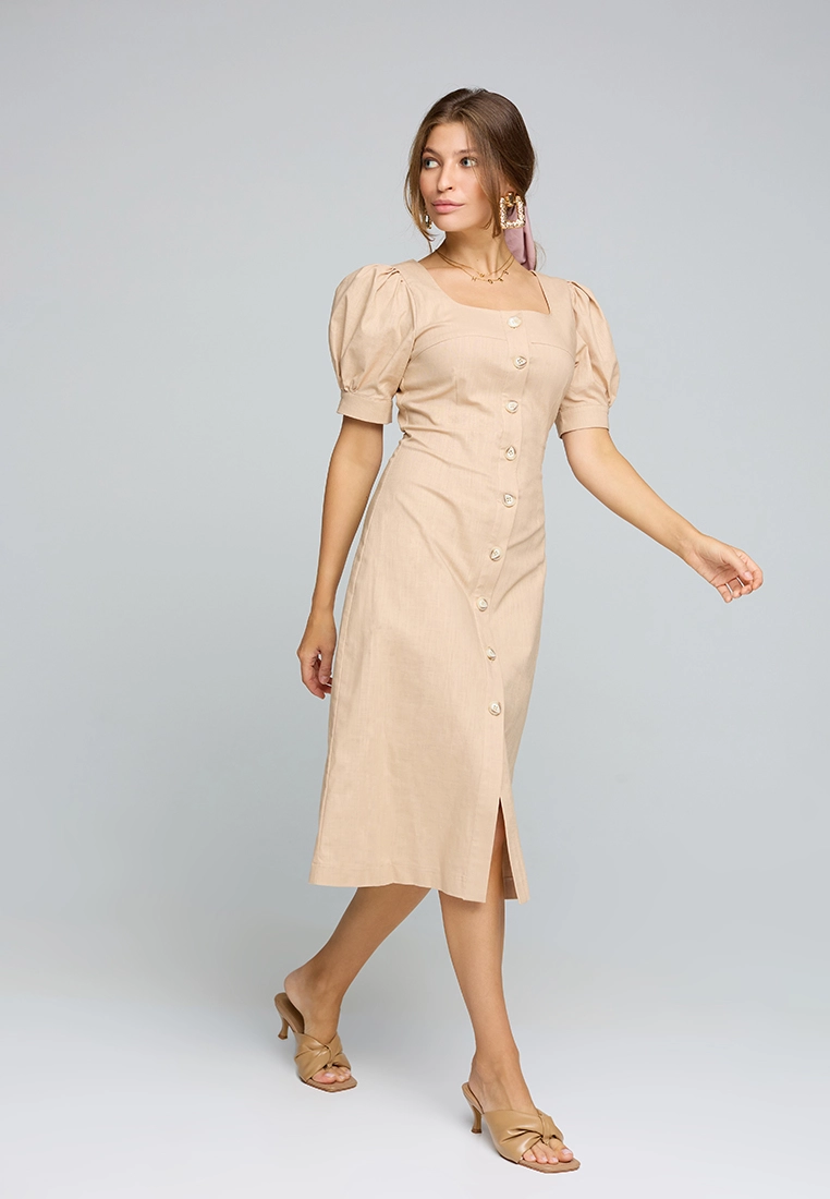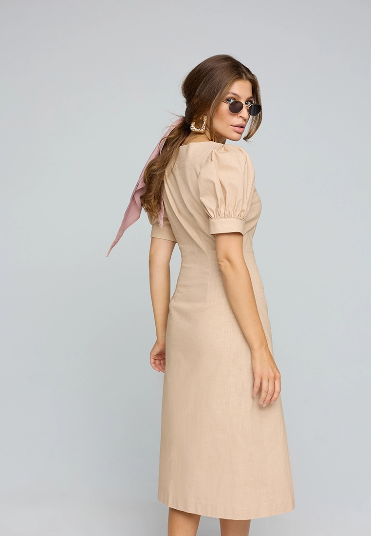 Платье длины миди из легкой летней ткани; приталенный крой; короткий, широкий рукав собран на резинку; по груди фигурный вырез; сзади разрез-шлица
