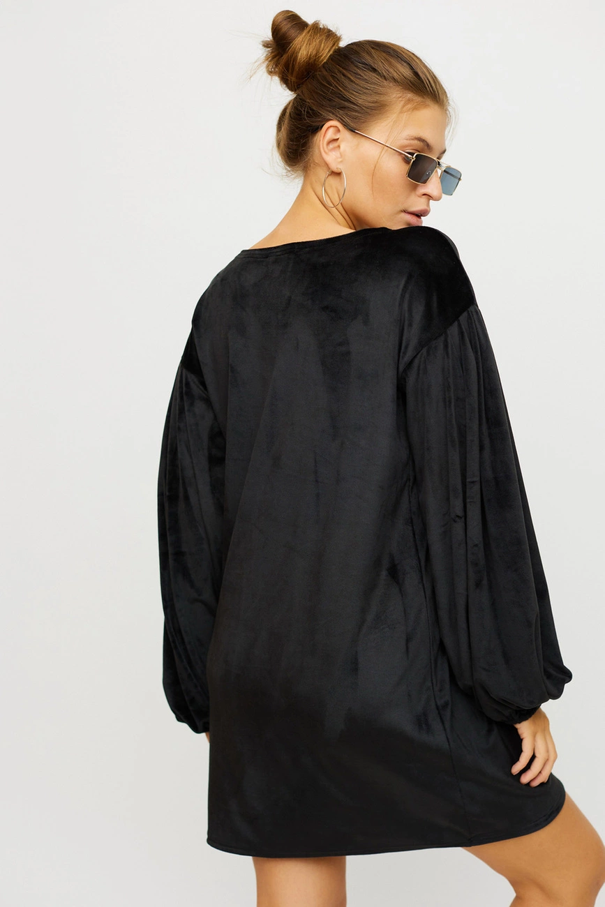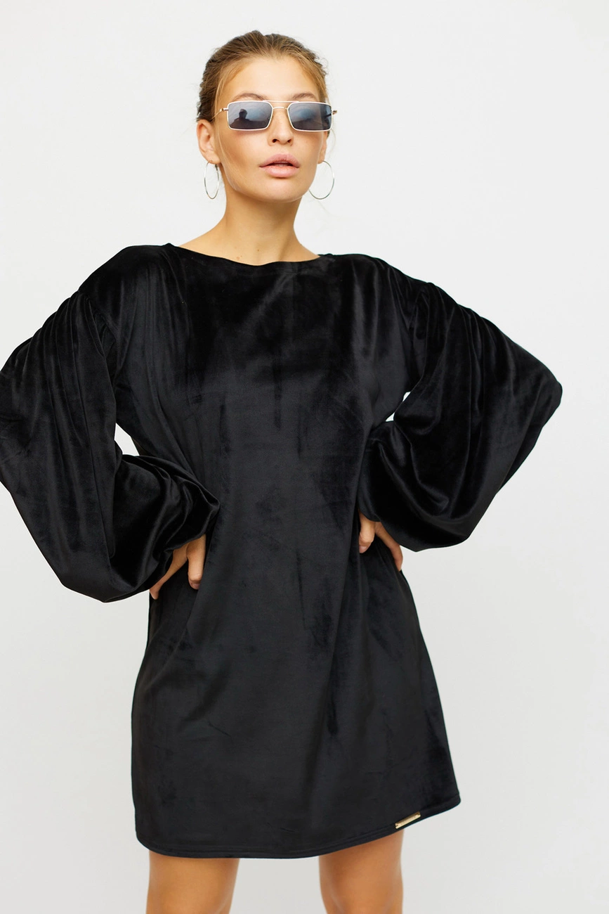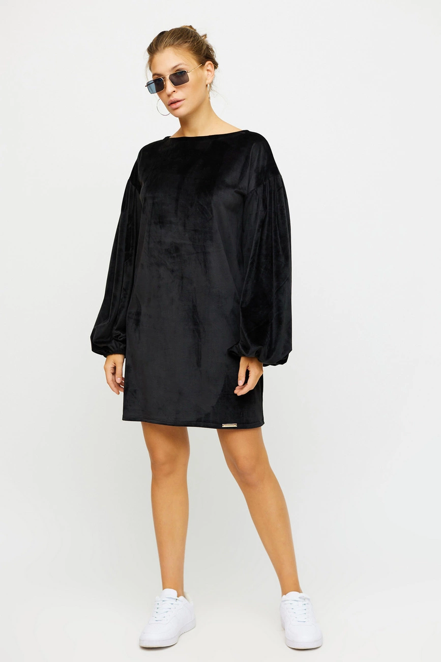 Платье мини из мягкого ворсистого трикотажа, спущенная линия плеча, широкий рукав собран внизу на резинку