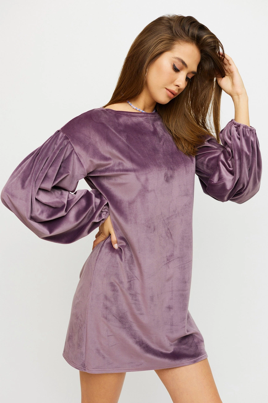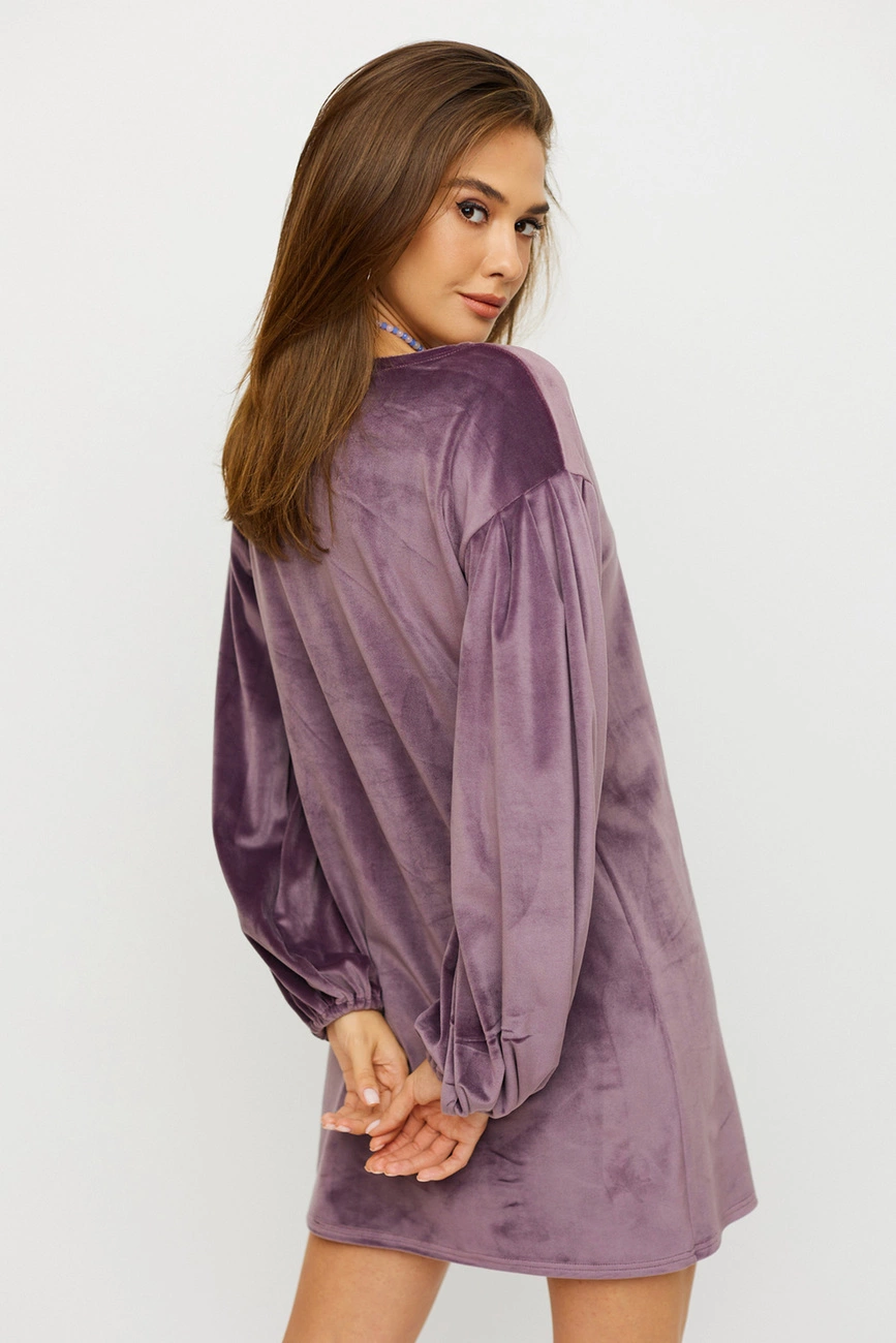 Платье мини из мягкого ворсистого трикотажа, спущенная линия плеча, широкий рукав собран внизу на резинку