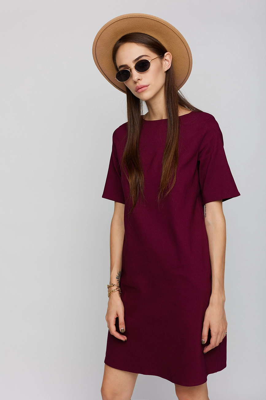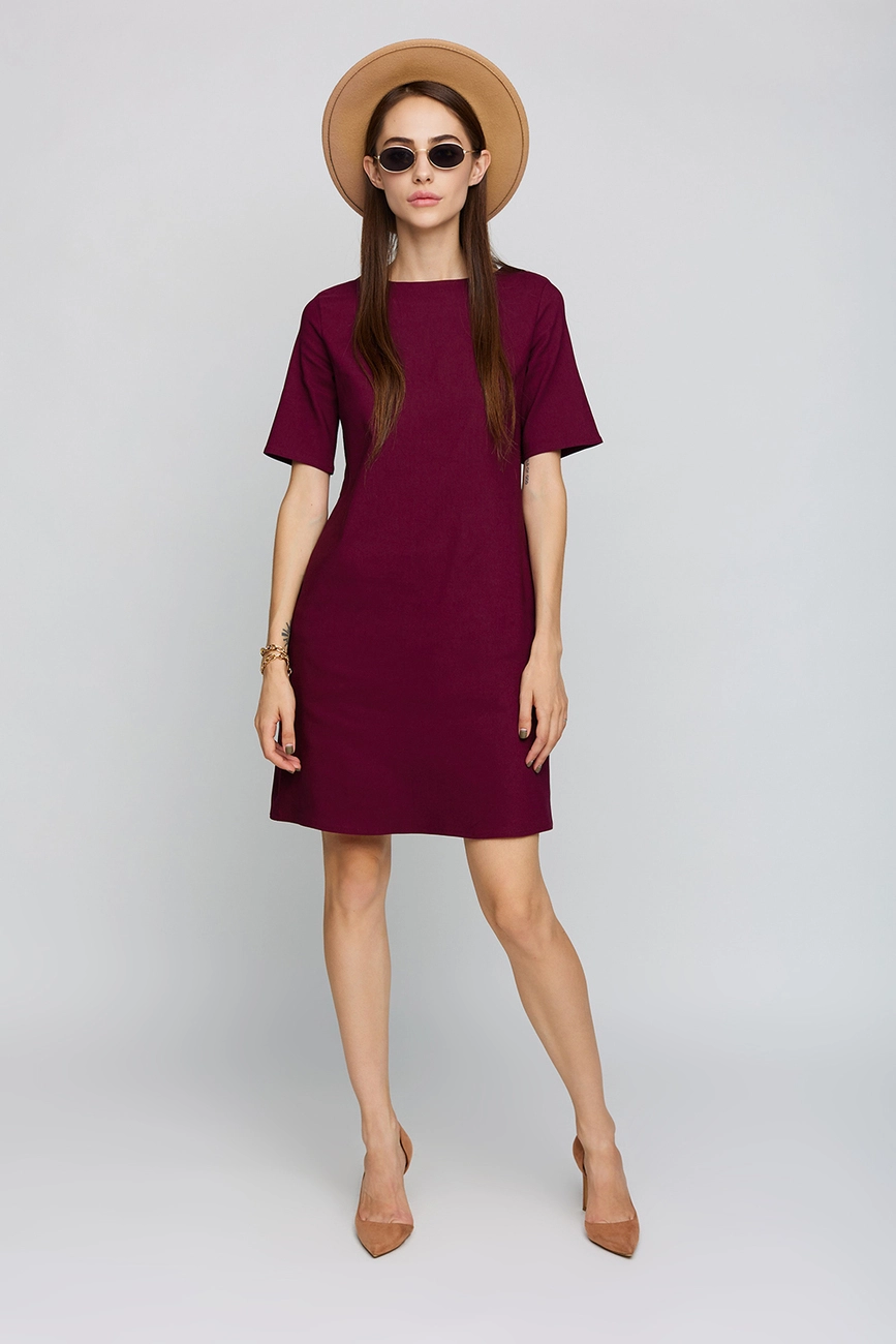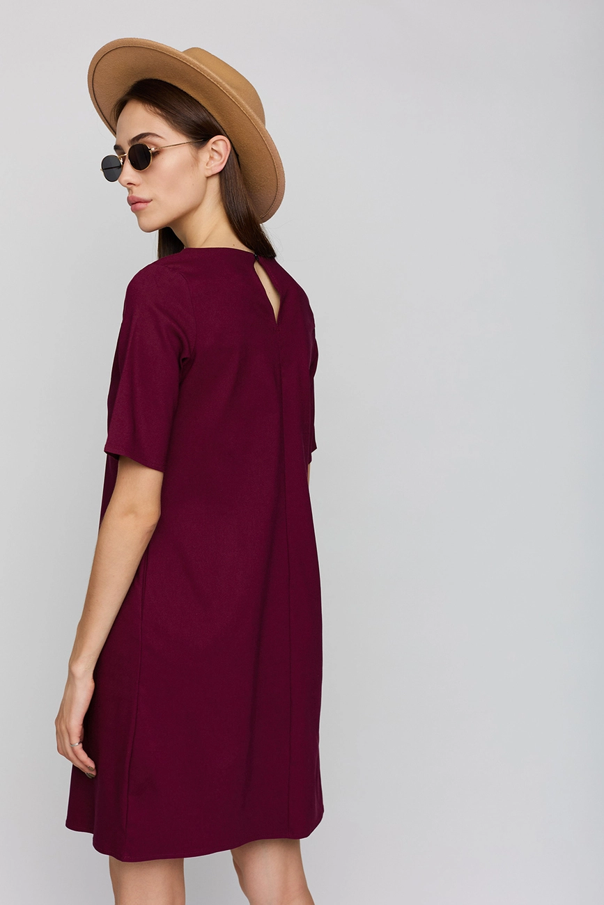 Платье средней длины трапецевидного кроя из плотной слегка тянущейся ткани, короткие рукава, карманы в боковых швах; застежка: пуговица сзади