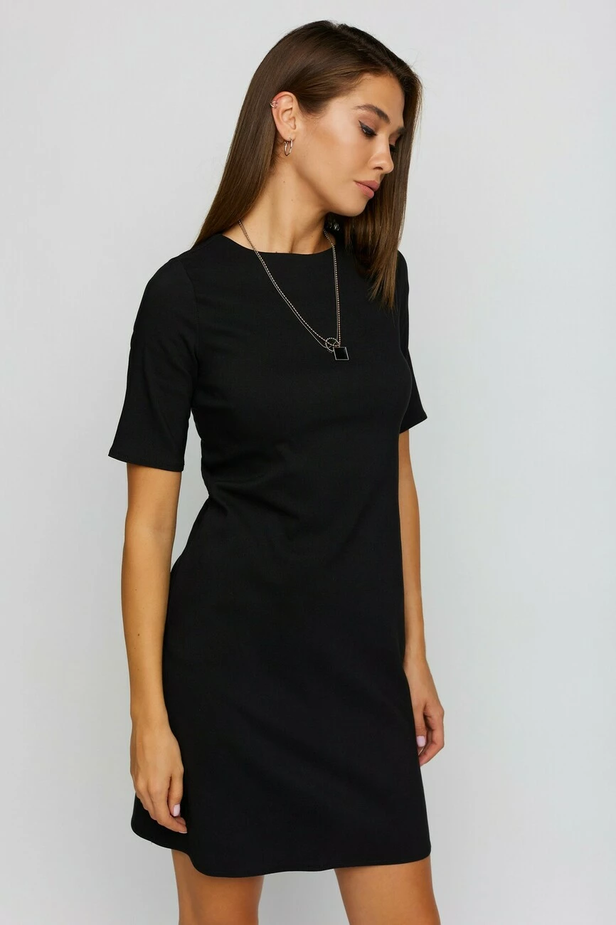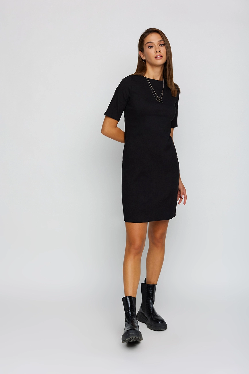 Платье средней длины трапецевидного кроя из плотной слегка тянущейся ткани, короткие рукава, карманы в боковых швах; застежка: пуговица сзади