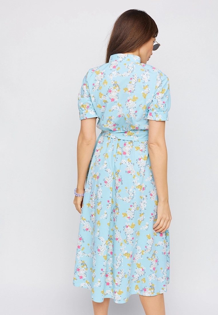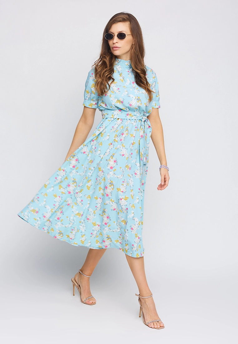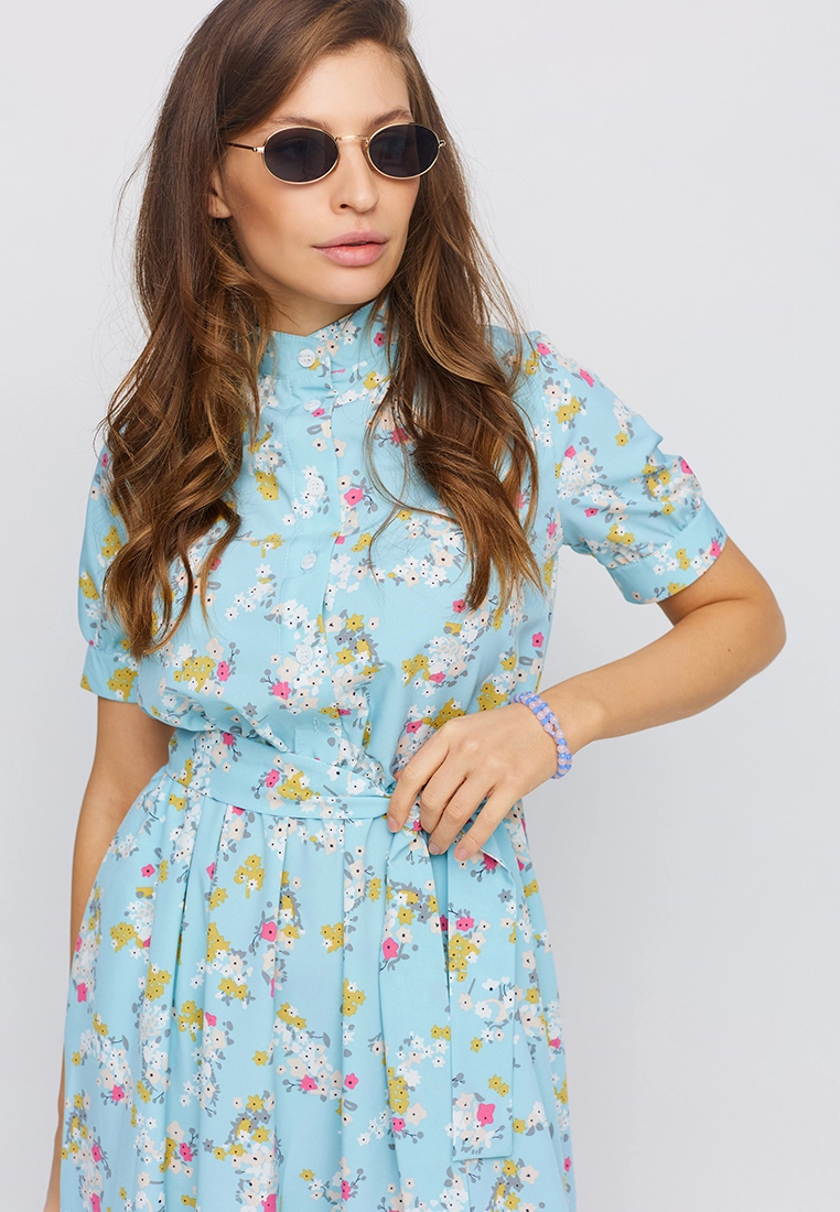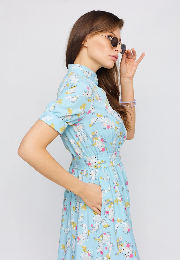 Платье приталенного кроя из приятной на ощупь ткани, воротник- стойка, рукав короткий с манжетами на пуговицах , отрезная линия талии, длина миди; застежка: пуговицы, пояс в комплекте; есть карманы