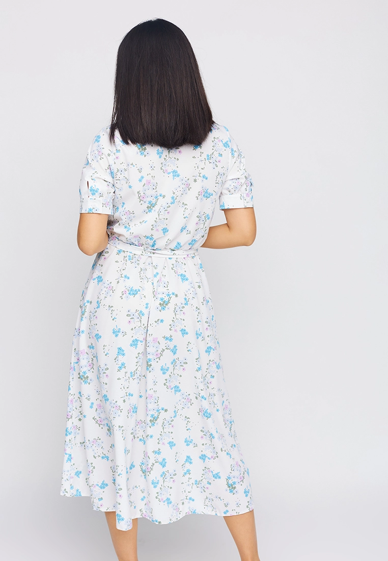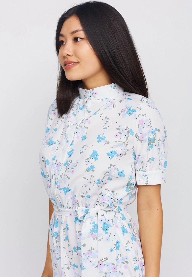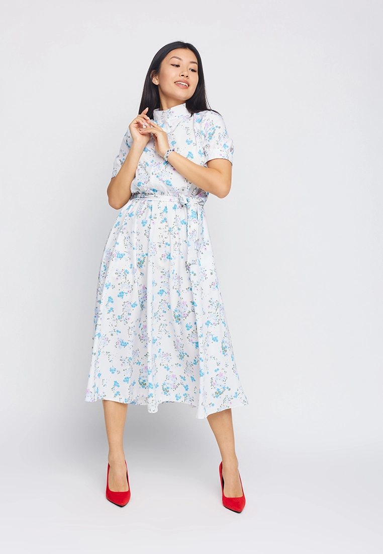 Платье приталенного кроя из приятной на ощупь ткани, воротник- стойка, рукав короткий с манжетами на пуговицах , отрезная линия талии, длина миди; застежка: пуговицы, пояс в комплекте; есть карманы