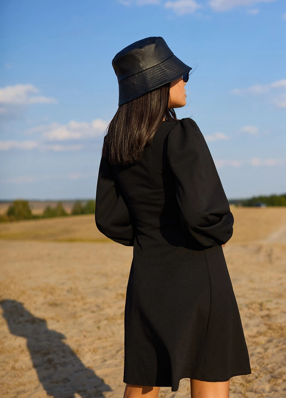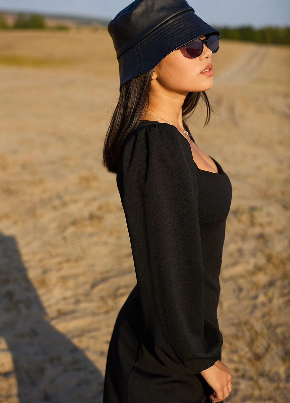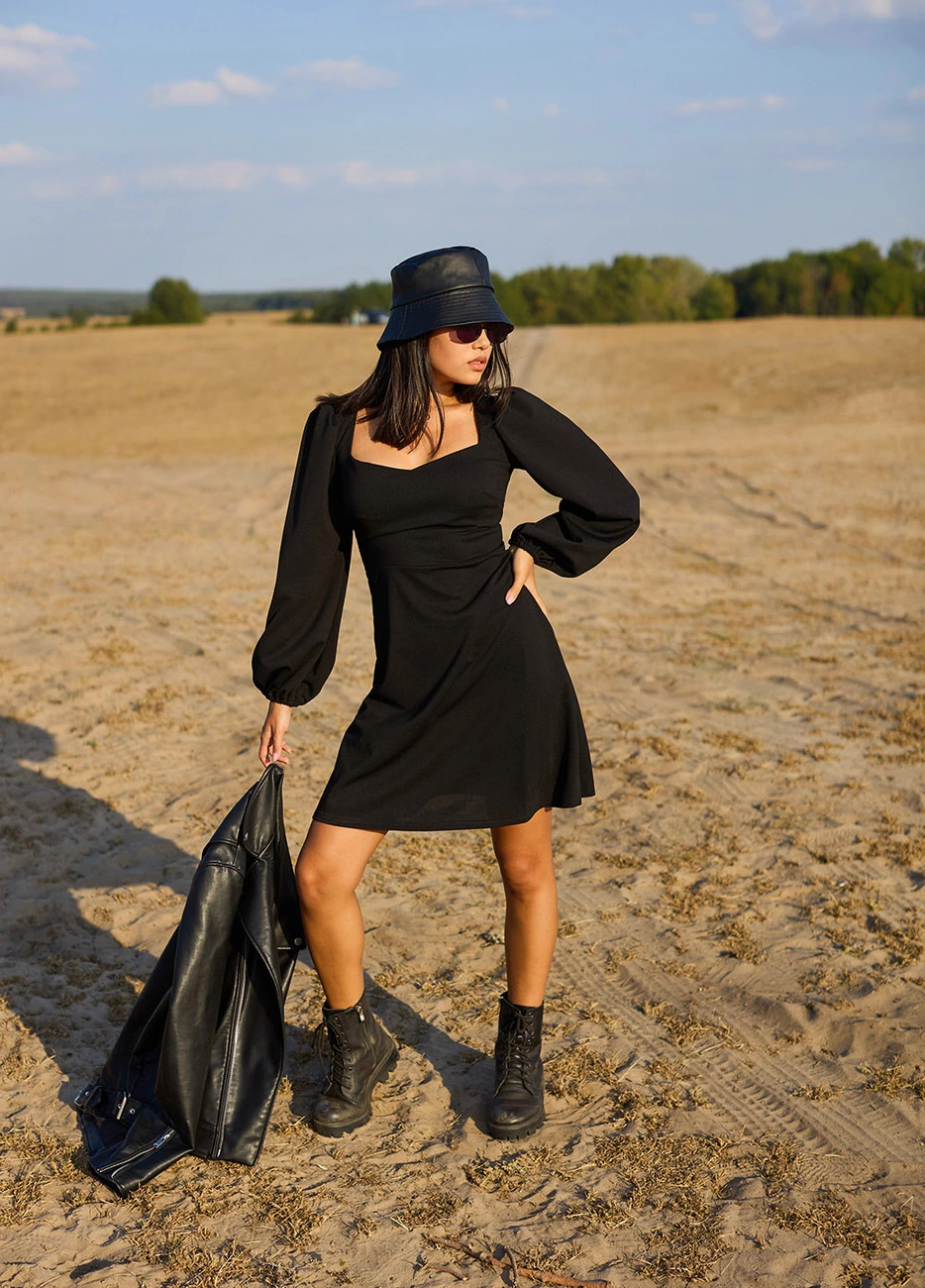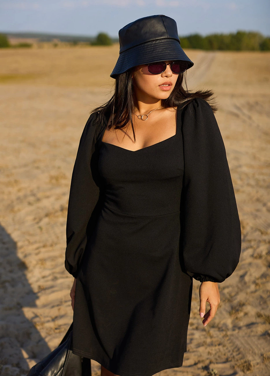 Платье мини из тянущейся фактурной ткани. Глубокое фигурное декольте, отрезная линия талии, юбка полусолнце, рукав широкий со сборкой по плечу