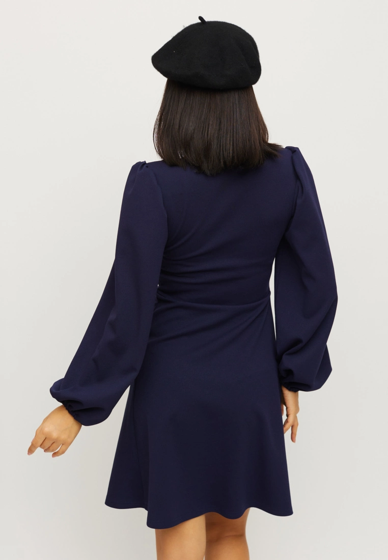Платье мини из тянущейся фактурной ткани. Глубокое фигурное декольте, отрезная линия талии, юбка полусолнце, рукав широкий со сборкой по плечу