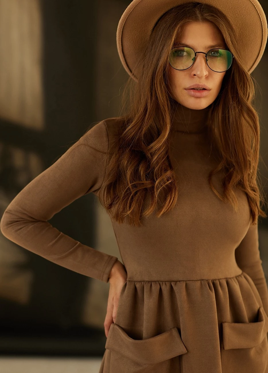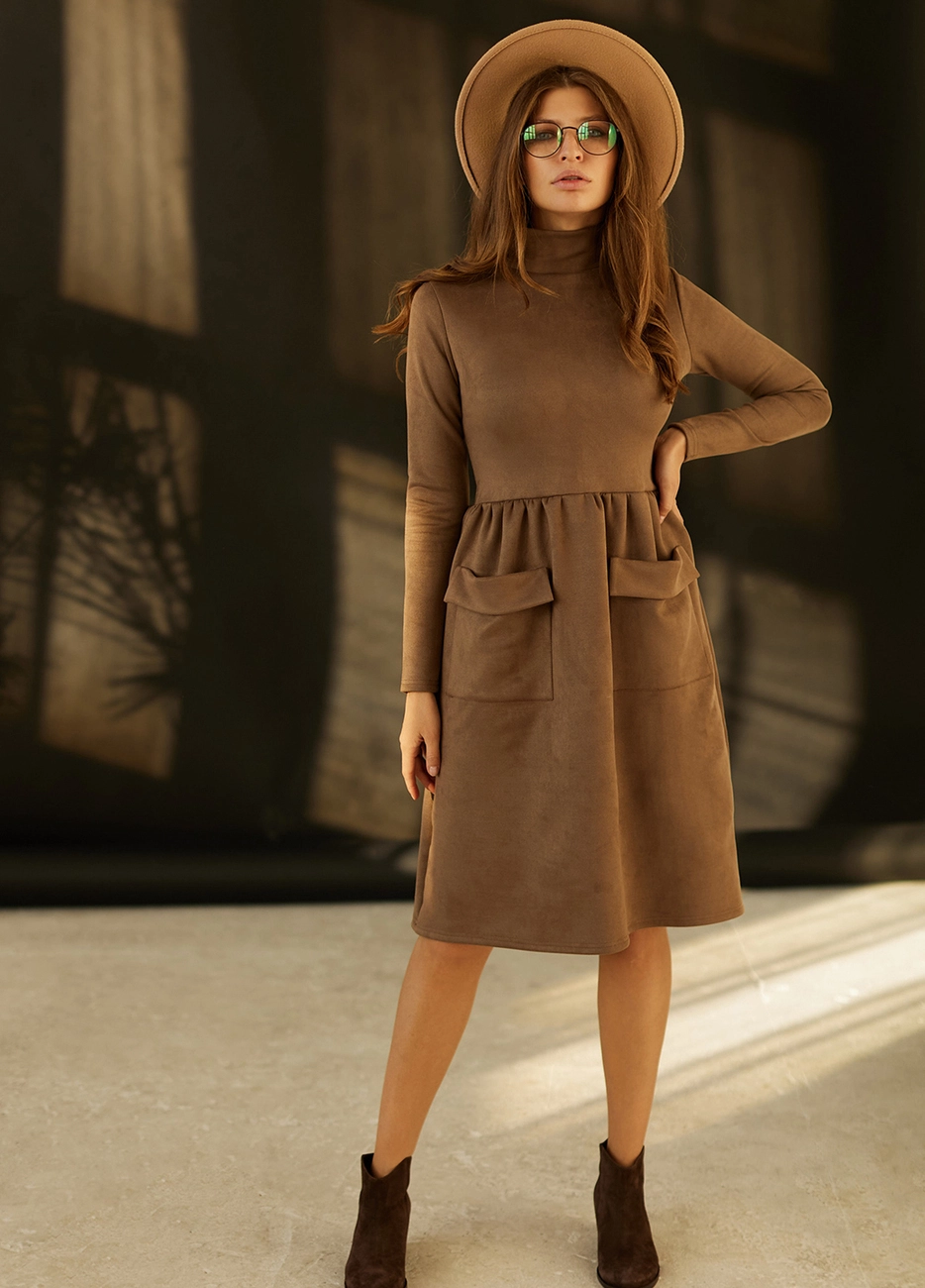 Платье из плотного замша с воротником-стойкой, отрезной линией талии и накладными карманами; рукав длинный; застежка: молния сзади