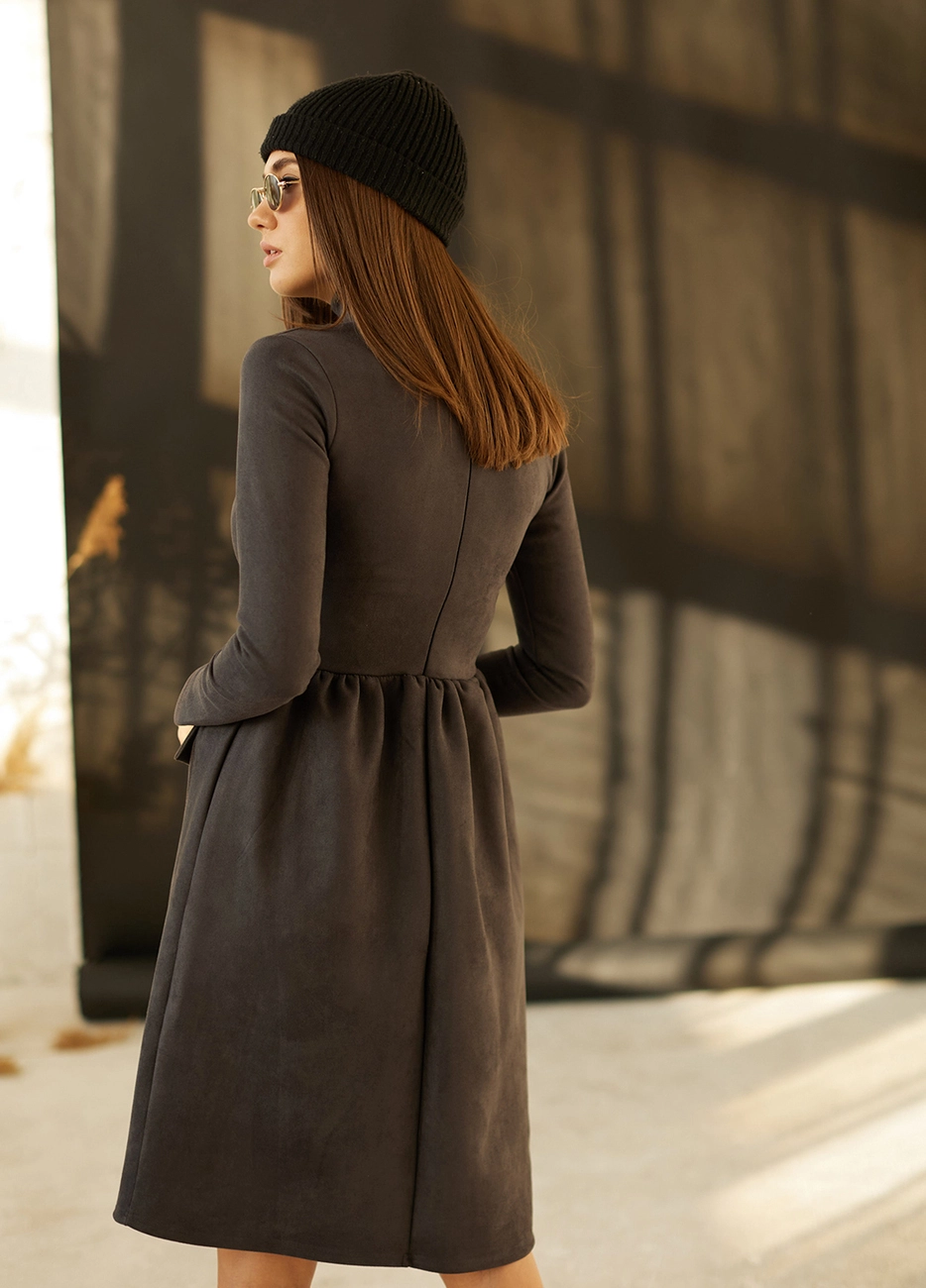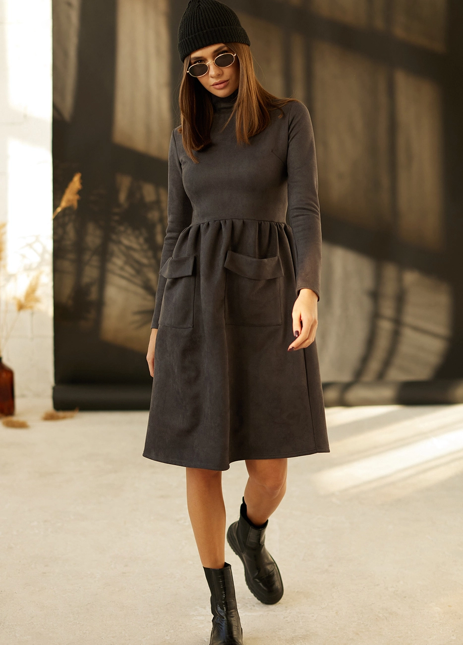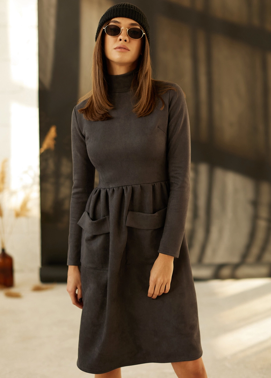 Платье из плотного замша с воротником-стойкой, отрезной линией талии и накладными карманами; рукав длинный; застежка: молния сзади