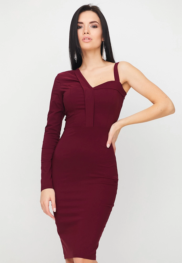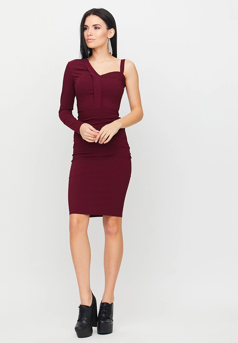 Платье-футляр с одним рукавом из эластичной ткани; отрезная линия талии; застежка: потайная молния сбоку