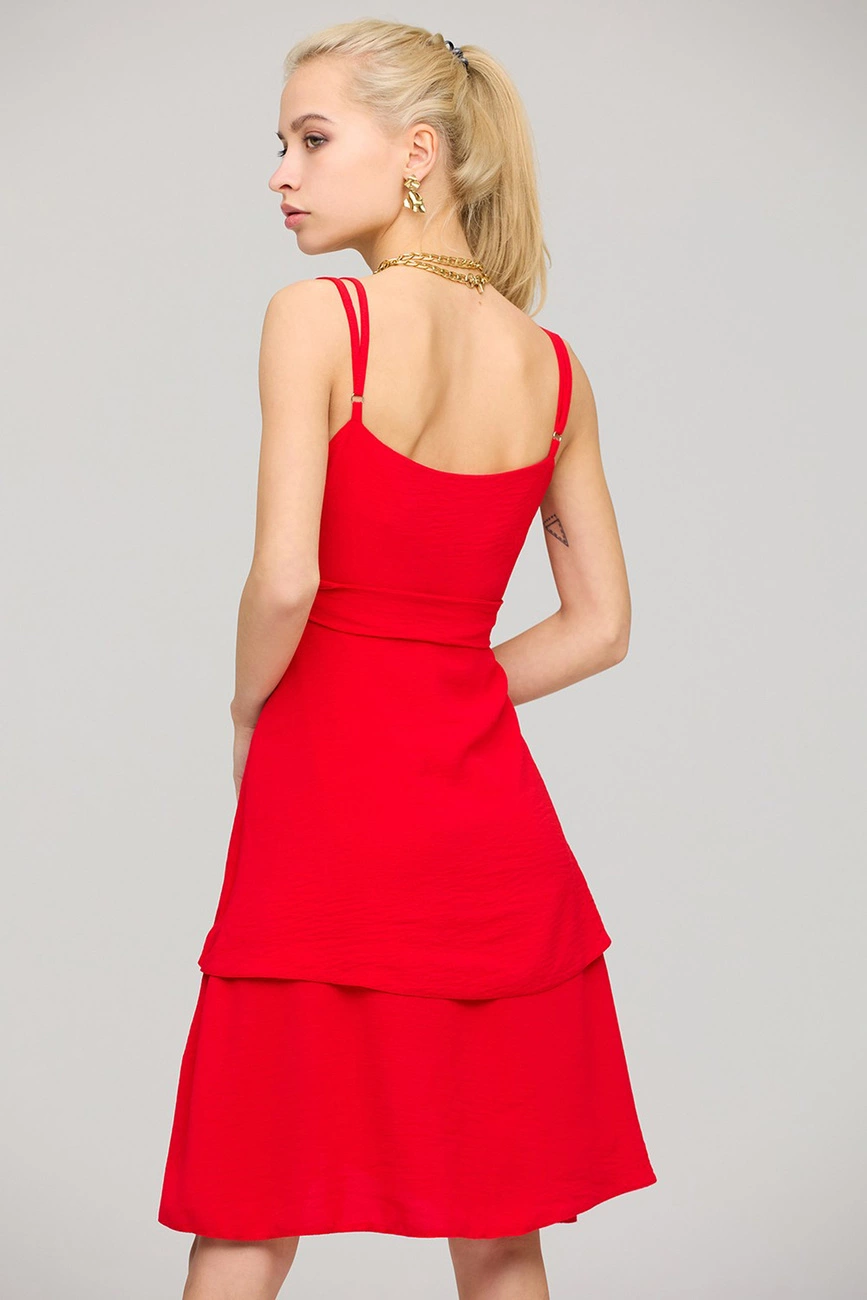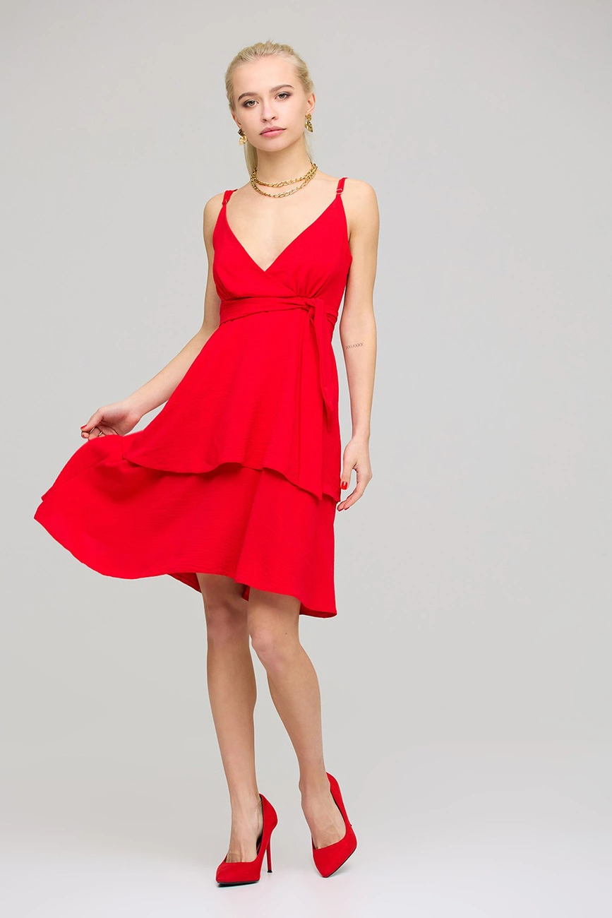 Платье мини из легкой летней ткани с эффектом жатки, отрезная линия талии, впереди запах, регулируемые бретели, двойная юбка. Застежка: молния, пояс в комплекте.
