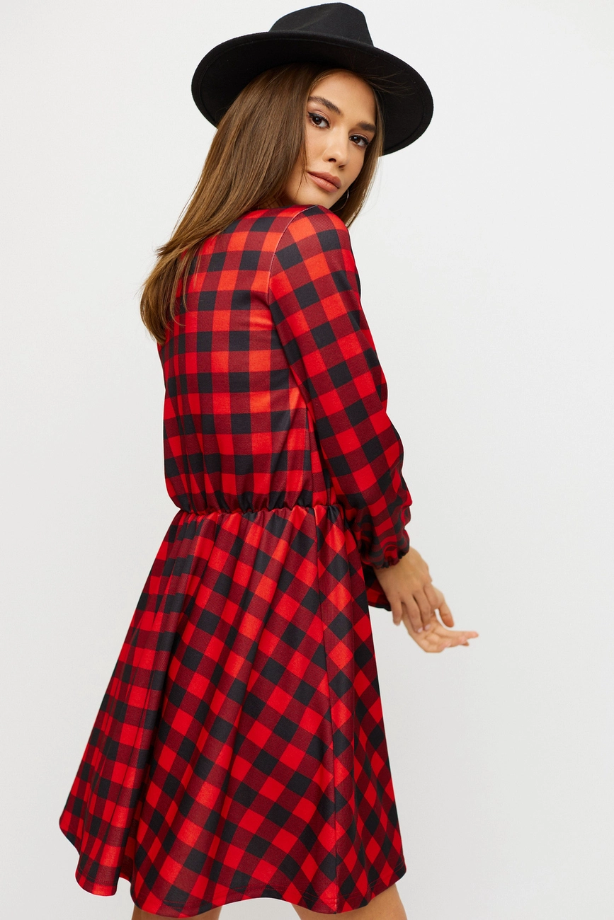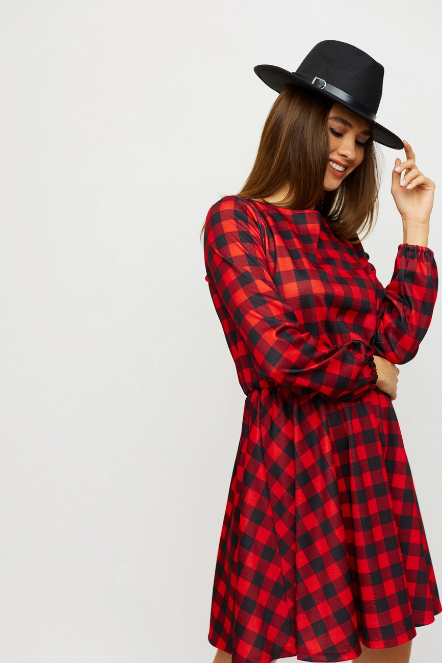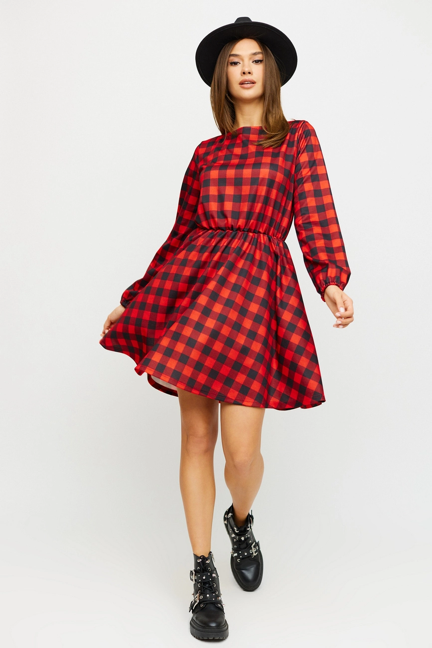 Платье мини длины из плотной слегка тянущейся ткани, длинный рукав собран на резинку, отрезная линия талии, юбка полусолнце