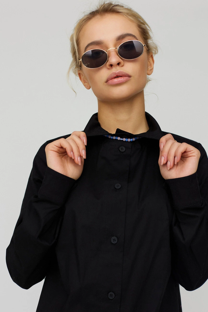 Рубашка из хлопковой ткани укороченного покроя, спущенная линия плеча, широкий рукав с манжетом, воротник-стойка, по низу рубашки манжет с завязкой