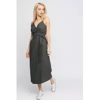 Платье с запахом из плотного льна; длина миди, глубокое декольте, тонкие бретели с регулятором, пояс вшит